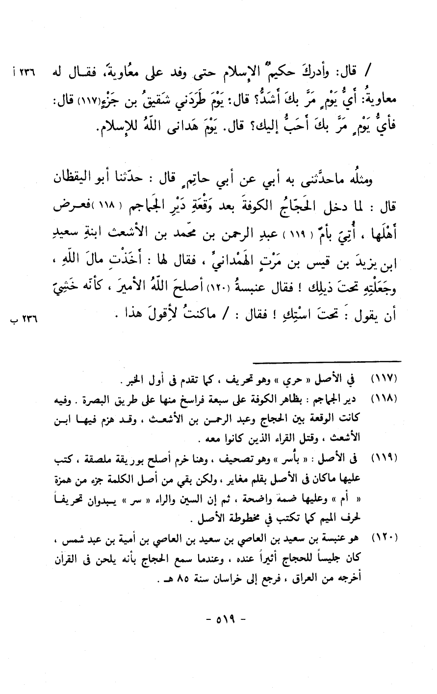 ومثله ما حدثني به أبي عن أبي حاتمٍ قال: حدثنا أبو اليقظان قال: لما دخل الحجاج الكوفة بعد وقعة دير الجماجم فعرض أهلها، أتي بأم عبد الرحمن بن محمد بن الأشعث ابنة سعيد ابن يزيد بن قيس بن مرتٍ الهمذاني، فقال لها: أخذت مال الله، وجعلته تحت ذيلك! فقال عنبسة أصلح الله الأمير، كأنه خشي أن يقول: تحت استك! فقال:/ ما كنت لأقول هذا.