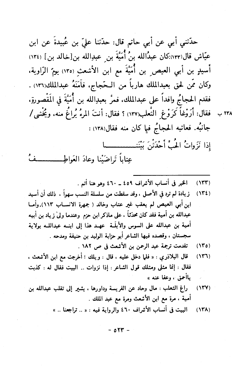 حدثني أبي عن أبي حاتم قال: حدثنا علي بن عبيدة عن ابن عياش قال: كان عبد الله بن أمية بن عبد الله بن [خالد بن] أسيدٍ بن أبي العيص بن أمية مع ابن الأشعث يوم الراوية، وكان ممن لحق بعبد الملك هارباً من الحجاج، فآمنه عبد الملك. فقدم الحجاج وافداً على عبد الملك، فمر بعبد الله بن أمية في المقصورة، فقال: أروغاً كروغ الثعلب؟ فقال: أنت المرء يراغ منه، ويخشى/ جانبه. فعاتبه الحجاج فيما كان منه فقال: