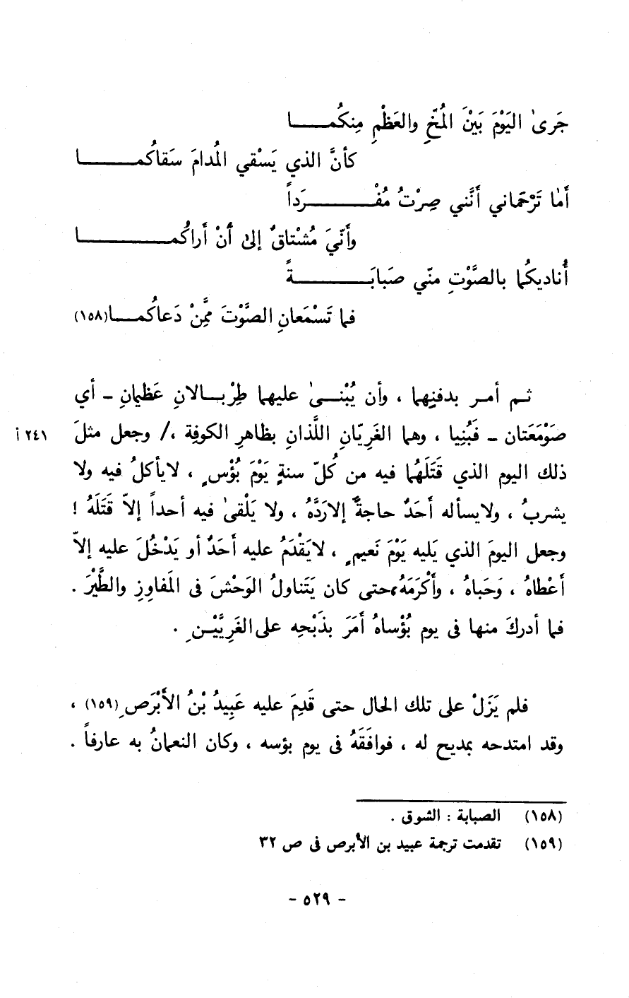فلم يزل على تلك الحال حتى قدم عليه عبيد بن الأبرص, وقد امتدحه بمديح له, فوافقه في يوم بؤسه, وكان النعمان به عارفاً.