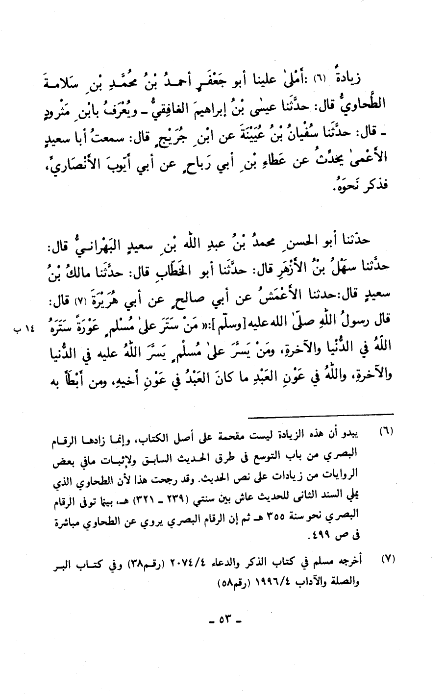 حدثنا أبو الحسن محمد بن عبد الله بن سعيدٍ البهراني قال: حدثنا سهل بن الأزهر قال: حدثنا أبو الخطاب قال: حدثنا مالك بن سعيدٍ قال: حدثنا الأعمش عن أبي صالحٍ عن أبي هريرة قال: قال رسول الله صلى الله عليه وسلم : ((من ستر على مسلمٍ عورةً ستره الله في الدنيا والآخرة، ومن يسر على مسلمٍ يسر الله عليه في الدنيا والآخرة، والله في عون العبد ما كان العبد في عون أخيه، ومن أبطأ به