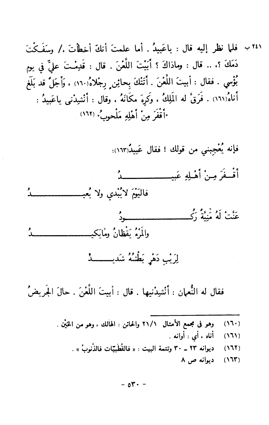 فلما نظر إليه قال: يا عبيد. أما علمت أنك أخطأت, / وسفكت دمك؟,.. قال: وما ذاك؟ أبيت اللعن. قال: قدمت علي في يوم بؤسي. فقال: أبيت اللعن. أتتك بحائنٍ رجلاه, وأجلٌ قد بلغ أناه. فرق له الملك, وكره مكانه, وقال: أنشدني يا عبيد: