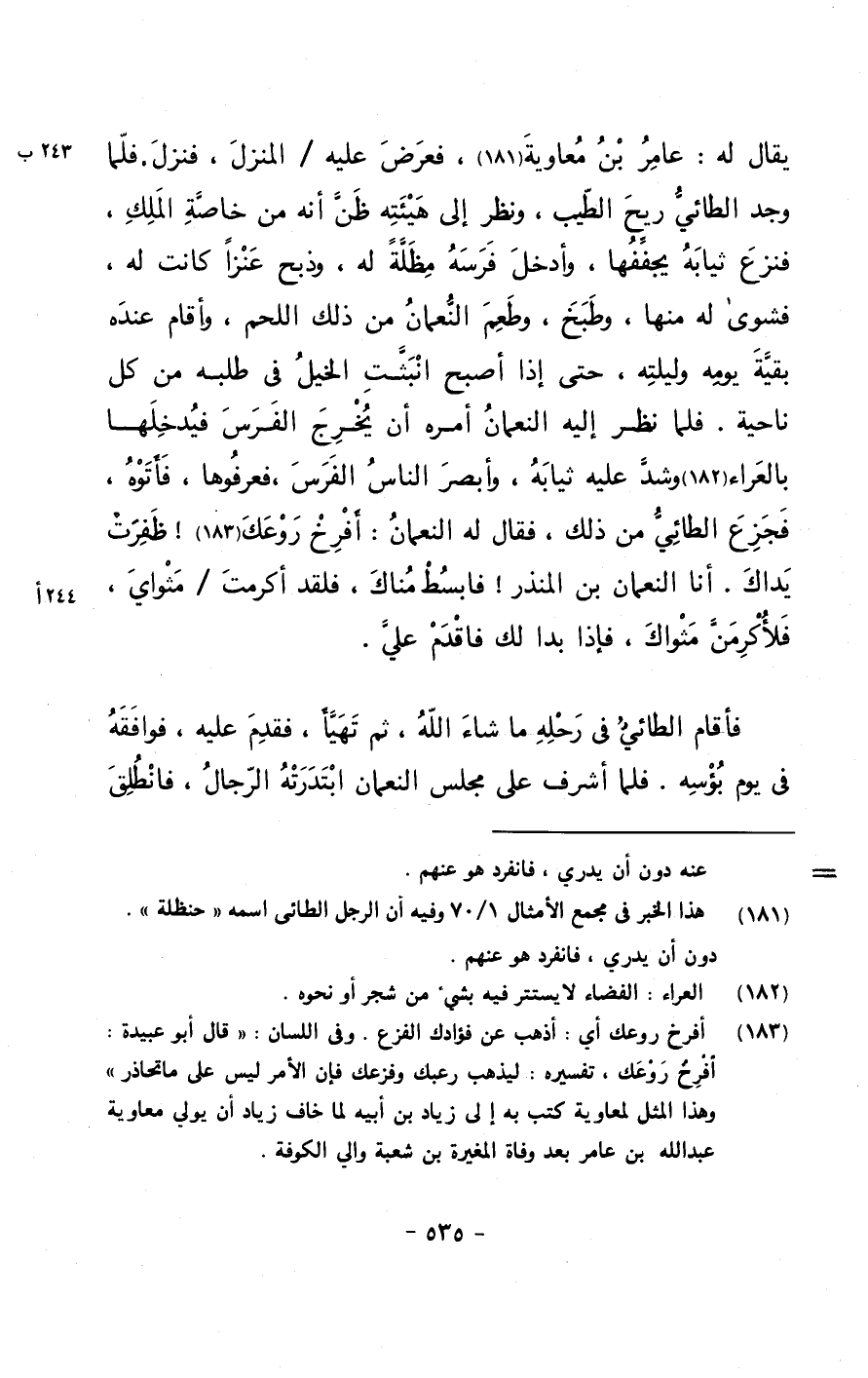 يقال له: عامر بن معاوية, فعرض عليه/ المنزل, فنزل. فلما وجد الطائي ريح الطيب, ونظر إلى هيئته ظن أنه من خاصة الملك, فنزع ثيابه يجففها, وأدخل فرسه مظلةً له, وذبح عنزاً كانت له, فشوى له منها, وطبخ, وطعم النعمان من ذلك اللحم, وأقام عنده بقية يومه وليلته, حتى إذا أصبح انبثت الخيل في طلبه من كل ناحية. فلما نظر إليه النعمان أمره أن يخرج الفرس فيدخلها بالعراء وشد عليه ثيابه, وأبصر الناس الفرس, فعرفوها, فأتوه, فجزع الطائي من ذلك, فقال له النعمان: أفرخ روعك! ظفرت يداك. أنا النعمان بن المنذر! فابسط مناك, فلقد أكرمت/ مثواي, فلأكرمن مثواك, فإذا بدا لك فاقدم علي.