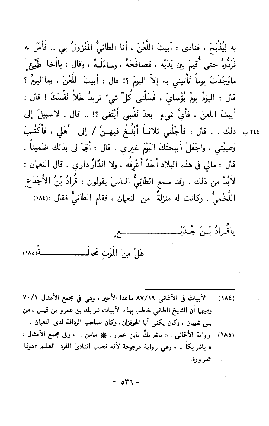 به ليذبح، فنادى: أبيت اللعن، أنا الطائي المنزول بي.. فأمر به فردوه حتى أقيم بين يديه، فصافحه، وساءله، وقال: يا أخا طيءٍ ما وجدت يوماً تأتيني به إلا اليوم؟! قال: أبيت اللعن: وما اليوم؟ قال: اليوم يوم بؤساي، فسلني كل شيء تريد خلا نفسك! قال: أبيت اللعن، فأي شيءٍ بعد نفسي أبتغي؟!.. قال: لا سبيل إلى ذلك.. قال: فأجلني ثلاثاً أبلغ فيهن/ إلى أهلي، فأكتب وصيتي، واجعل ذبيحتك اليوم غيري. قال: أقم لي بذلك ضميناً. قال: ما لي في هذه البلاد أحدٌ أعرفه، ولا الدار داري. قال النعمان: لا بد من ذلك. وقد سمع الطائي الناس يقولون: قراد بن الأجدع اللخمي، وكانت له منزلةٌ من النعمان، فقام الطائي فقال: