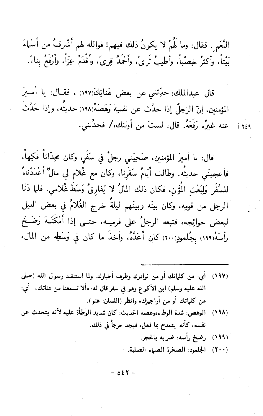قال: يا أمير المؤمنين, صحبني رجلٌ في سفرٍ, وكان محداثاً فكهاً, فأعجبني حديثه. وطالت أيام سفرنا, وكان مع غلام لي مالٌ أعددناه للسفر ولبعث المؤن, فكان ذلك المال لا يفارق وسط غلامي. فلما دنا الرجل من قومه, وكان بينه وبينهم ليلةٌ خرج الغلام في بعض الليل لبعض حوائجه, فتبعه الرجل على فرسه, حتى إذا أمكنه رضخ رأسه بجلمودٍ كان أعده, وأخذ ما كان في وسطه من المال,