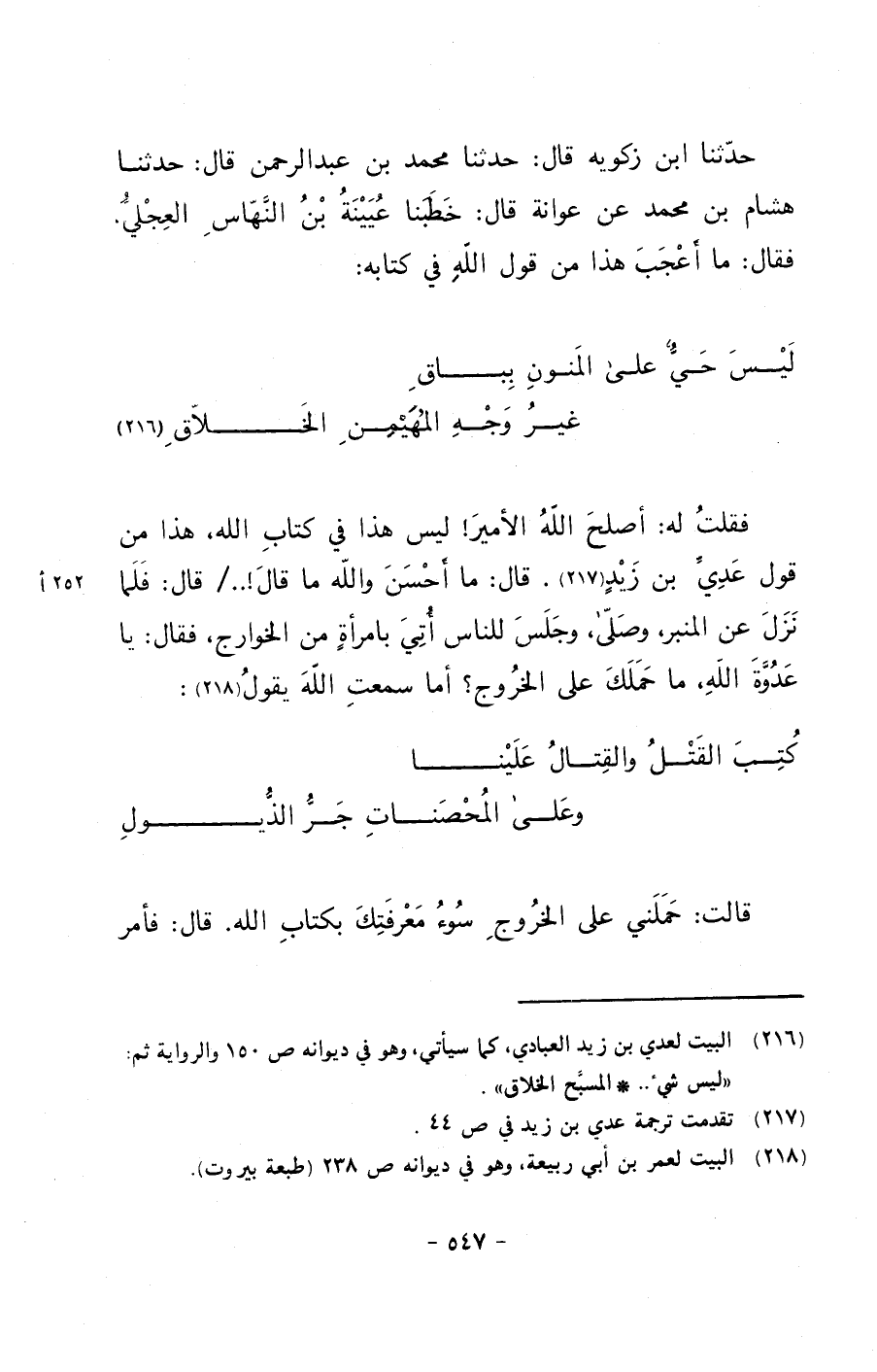 فقلت له: أصلح الله الأمير! ليس هذا في كتاب الله, هذا من قول عديٍ بن زيدٍ. قال: ما أحسن والله ما قال!../ قال: فلما نزل عن المنبر, وصلى, وجلس للناس أتي بامرأةٍ من الخوارج, فقال: يا عدوة الله, ما حملك على الخروج؟ أما سمعت الله يقول: