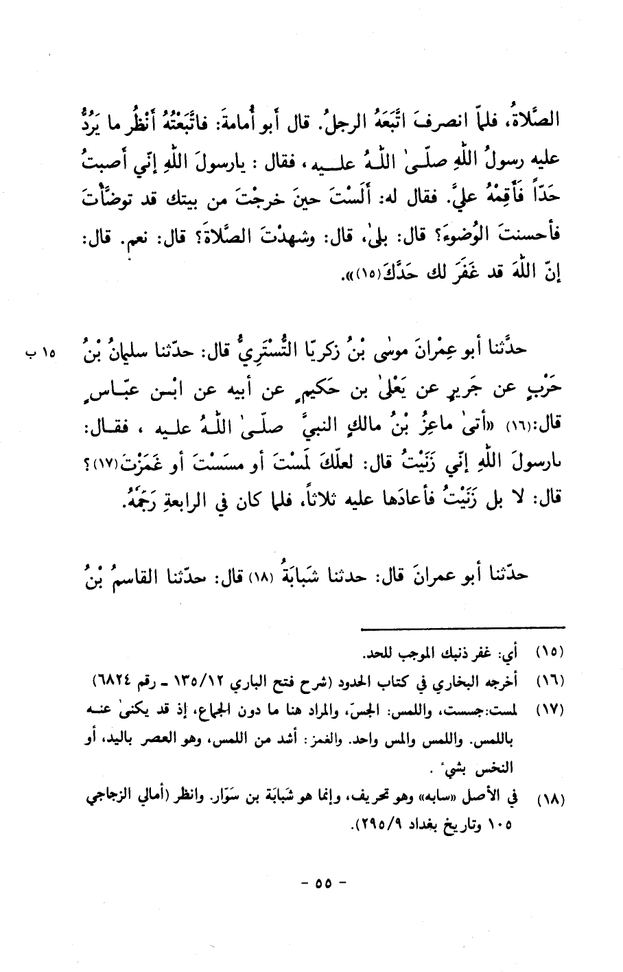 حدثنا أبو عمران موسى بن زكريا التستري قال: حدثنا سليمان بن حربٍ عن جريرٍ عن يعلى بن حكيمٍ عن أبيه عن ابن عباسٍ قال: ((أتى ماعز بن مالكٍ النبي صلى الله عليه وسلم ، فقال: يا رسول الله إني زنيت قال: لعلك لمست أو مسست أو غمزت؟ قال: لا، بل زنيت فأعادها عليه ثلاثاً، فلما كان في الرابعة رجمه.