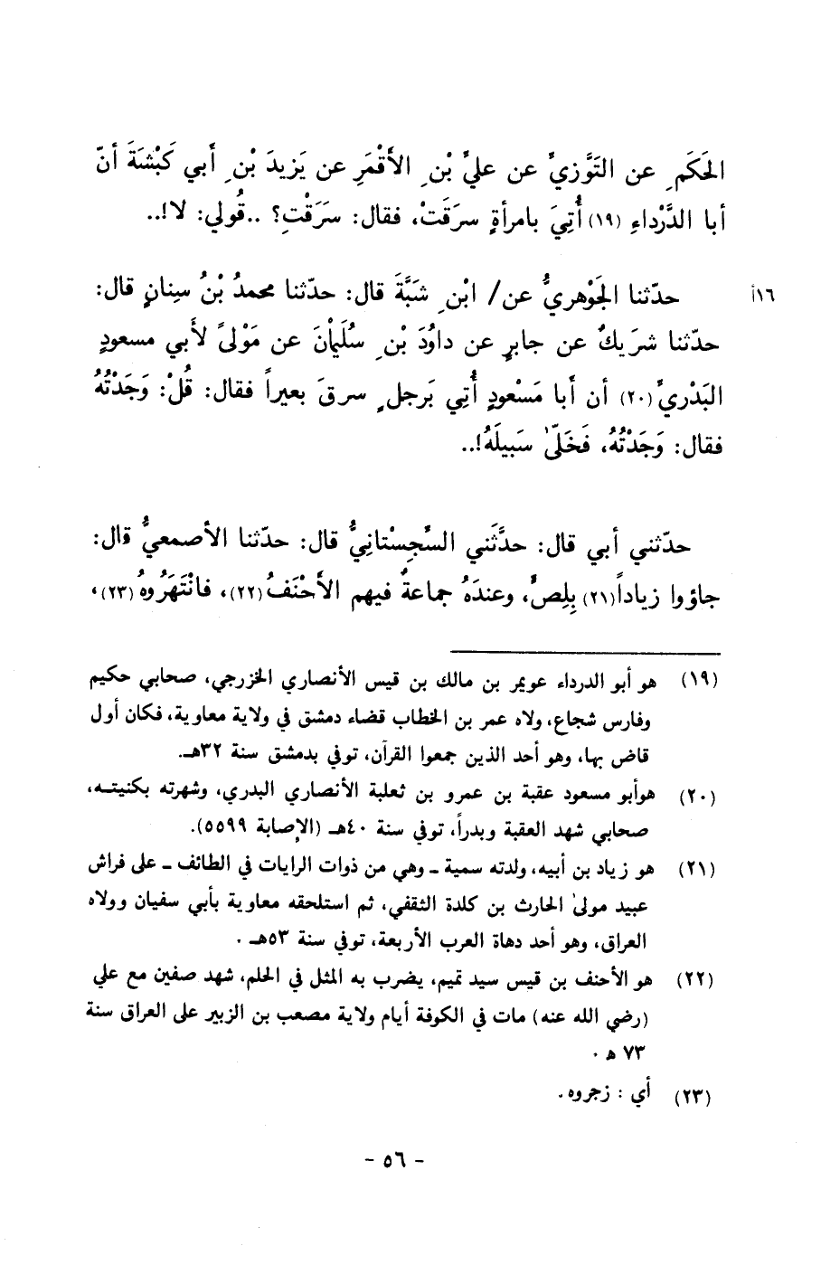 حدثنا الجوهري عن/ ابن شبة قال: حدثنا محمد بن سنانٍ قال: حدثنا شريكٌ عن جابرٌ عن داود بن سليمان عن مولى لأبي مسعودٍ البدري أن أبا مسعودٍ أتي برجلٍ سرق بعيراً فقال: قل: وجدته فقال: وجدته، فخلى سبيله!..