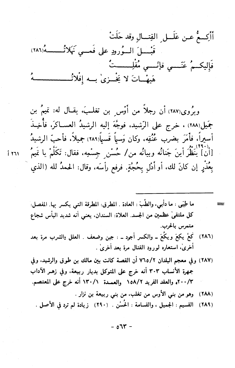 ويروى أن رجلاً من أوس بن تغلب، يقال له: تميم بن جميل، خرج على الرشيد، فوجه إليه الرشيد العساكر، فأخذ أسيراً، فأمر بضرب عنقه، وكان وسيماً قسيماً جميلاً، فأحب الرشيد [أن] ينظر أين جنانه وبيانه من/ حسن جسمه، فقال: تكلم يا تميم بعذرٍ إن كان لك، أو أدل بحجةٍ. فرفع رأسه، وقال: الحمد لله {الذي