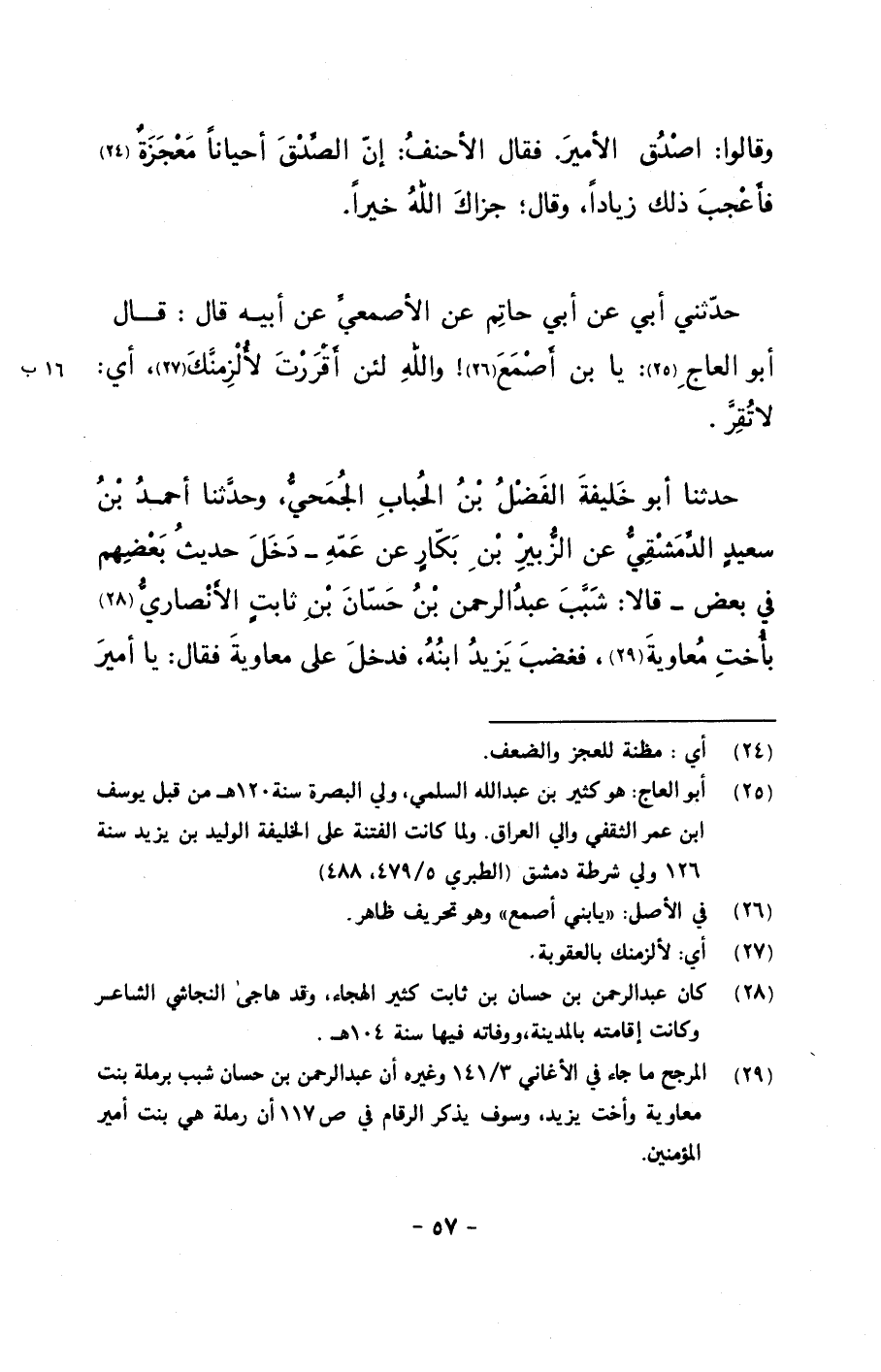 حدثني أبي عن أبي حاتم عن الأصمعي عن أبيه قال: قال أبو العاج: يا بن أصمع! والله لئن أقررت لألزمنك، أي:لا تقر.