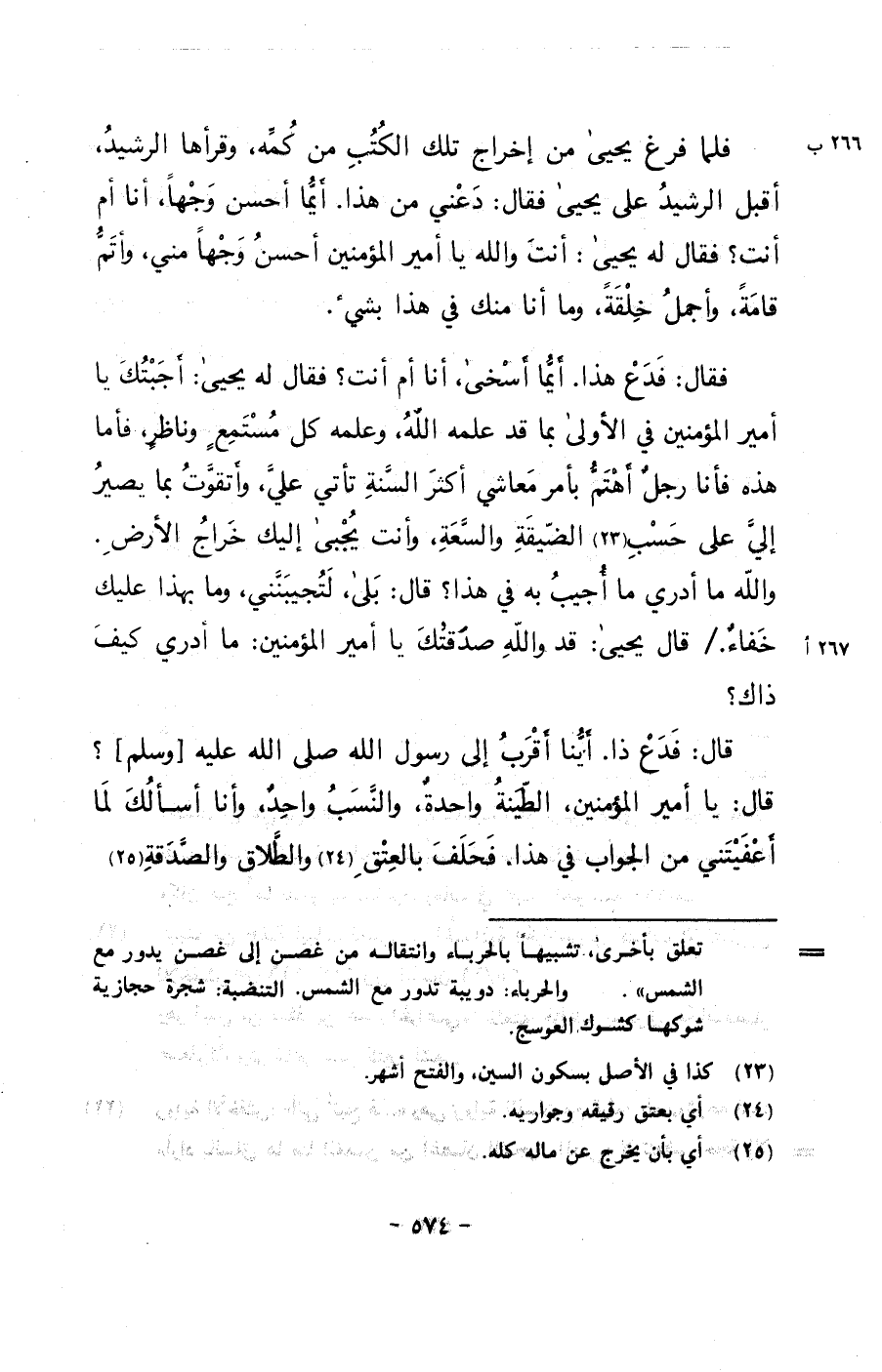 فلما فرغ يحيى من إخراج تلك الكتب من كمه، وقرأها الرشيد، أقبل الرشيد على يحيى فقال: دعني من هذا. أيما أحسن وجهاً، أنا أم أنت؟ فقال له يحيى: أنت والله يا أمير المؤمنين أحسن وجهاً مني، وأتم قامةً، وأجمل خلقةً، وما أنا منك في هذا بشيء.