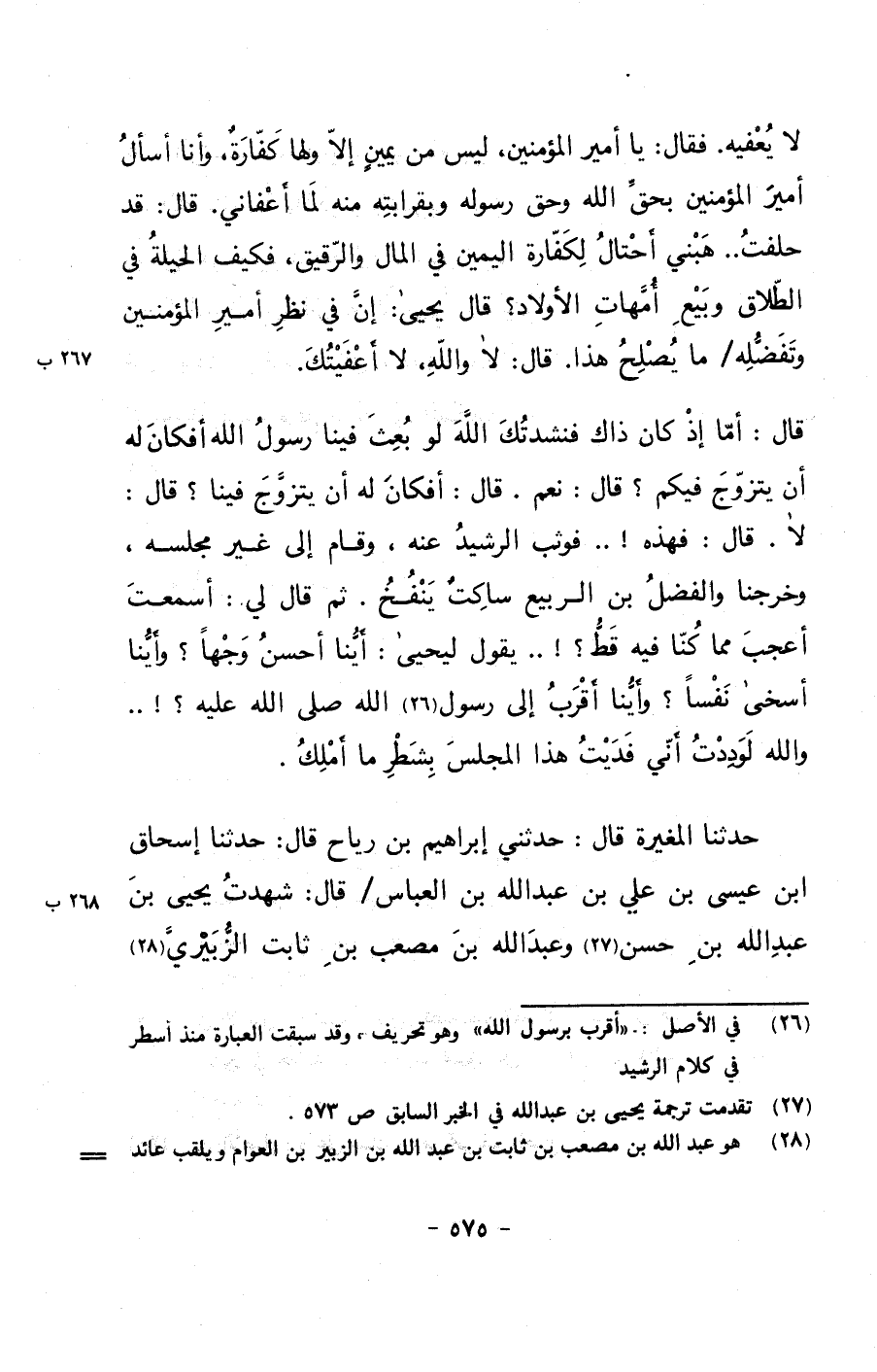 لا يعفيه. فقال: يا أمير المؤمنين, ليس من يمينٍ إلا ولها كفارةٌ, وأنا أسأل أمير المؤمنين بحق الله وحق رسوله وبقرابته منه لما أعفاني. قال: قد حلفت.. هبني أحتال لكفارة اليمين في المال والرقيق, فكيف الحيلة في الطلاق وبيع أمهات الأولاد؟ قال يحيى: إن في نظر أمير المؤمنين وتفضله/ ما يصلح هذا. قال: لا والله, لا أعفيتك.