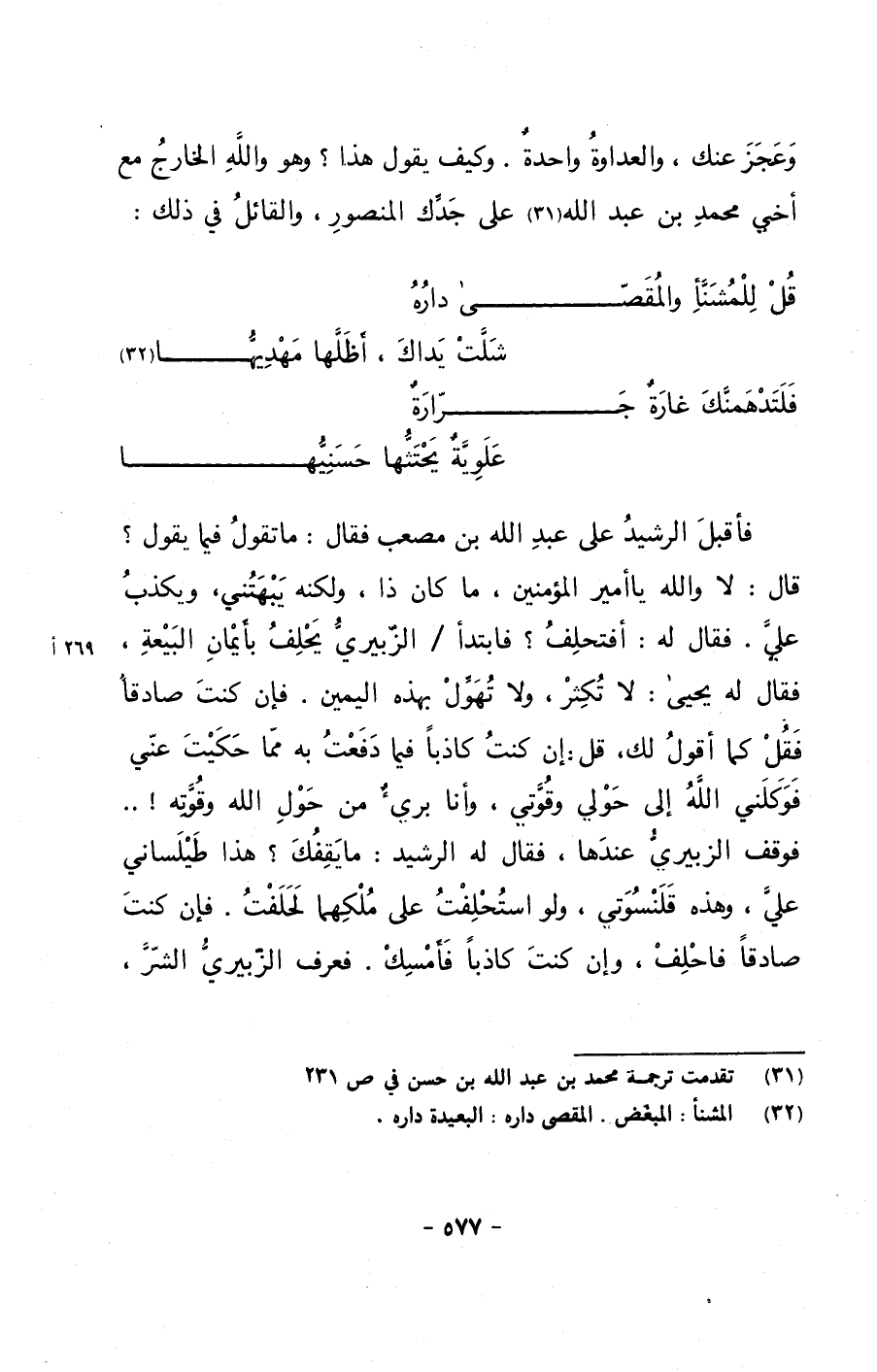 فأقبل الرشيد على عبد الله بن مصعب فقال: ما تقول فيما يقول؟ قال: لا والله يا أمير المؤمنين, ما كان ذا, ولكنه يبهتني, ويكذب علي. فقال له: أفتحلف؟ فابتدأ/ الزبيري يحلف بأيمان البيعة, فقال له يحيى: لا تكثر, ولا تهول بهذه اليمين. فإن كنت صادقاً فقل كما أقول لك, قل: إن كنت كاذباً فيما دفعت به مما حكيت عني فوكلني الله إلى حولي وقوتي, وأنا بريءٌ من حول الله وقوته!.. فوقف الزبيري عندها, فقال له الرشيد: ما يقفك؟ هذا طيلساني علي, وهذه قلنسوتي, ولو استحلفت على ملكهما لحلفت. فإن كنت صادقاً فاحلف, وإن كنت كاذباً فأمسك. فعرف الزبيري الشر,