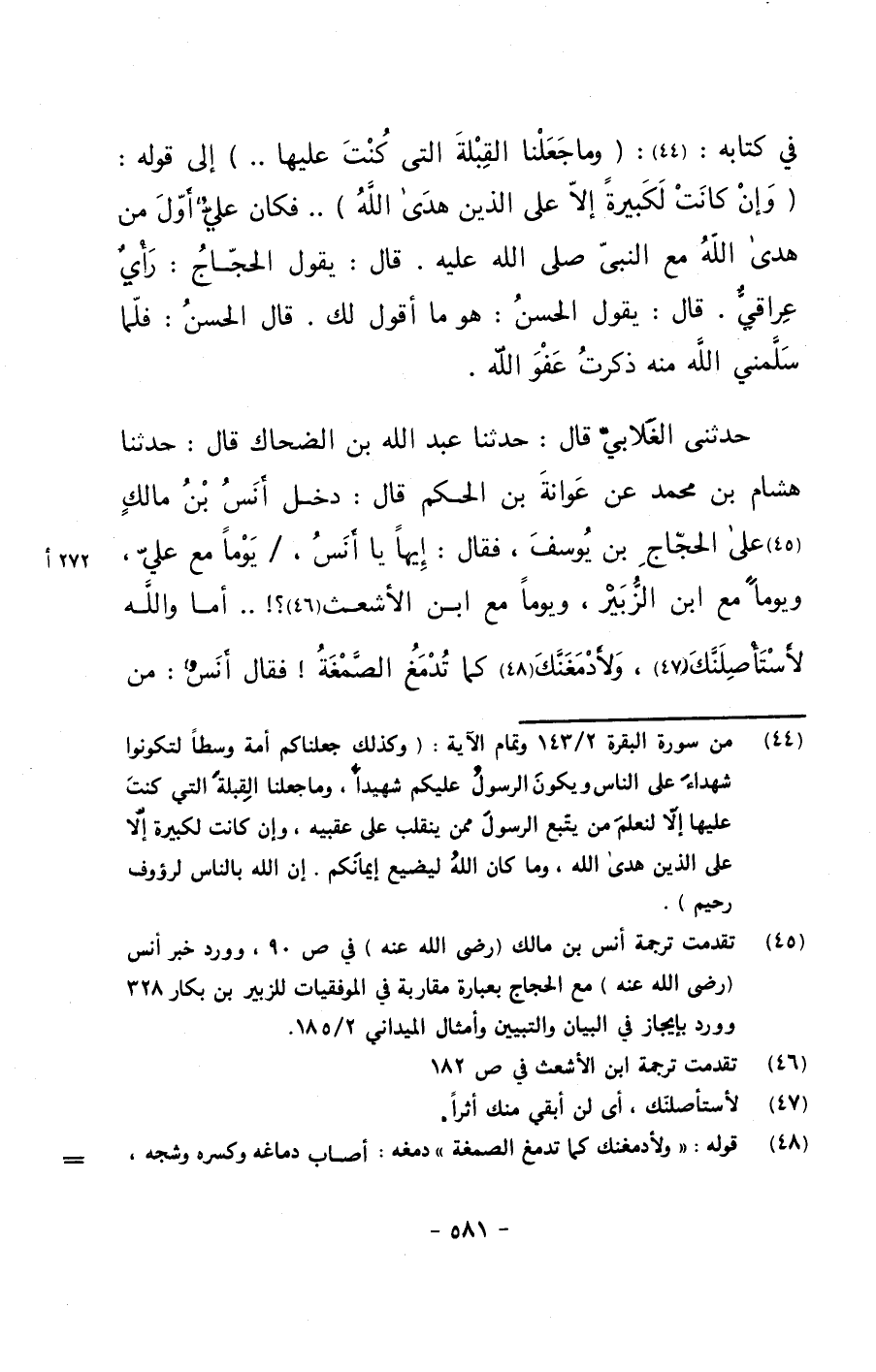 في كتابه: {وما جعلنا القبلة التي كنت عليها..} إلى قوله: {وإن كانت لكبيرة إلا على الذين هدى الله}.. فكان عليٌ أول من هدى الله مع النبي صلى الله عليه وسلم . قال: يقول الحجاج: رأيٌ عراقيٌ. قال: يقول الحسن: هو ما أقول لك. قال الحسن: فلما سلمني الله منه ذكرت عفو الله.
