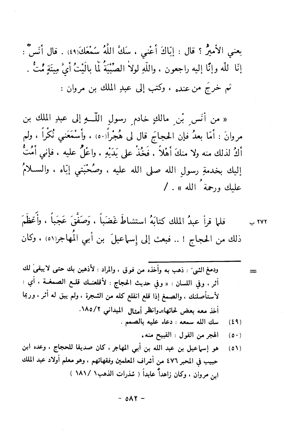 ((من أنس بن مالكٍ خادم رسول الله إلى عبد الملك بن مروان: أما بعد فإن الحجاج قال لي هجراً، وأسمعني نكراً، ولم أك لذلك منه ولا منك أهلاً، فخذ على يديه، واعل عليه، فإني أمت إليك بخدمة رسول الله صلى الله عليه وسلم ، وصحبتي إياه، والسلام عليك ورحمة الله))./