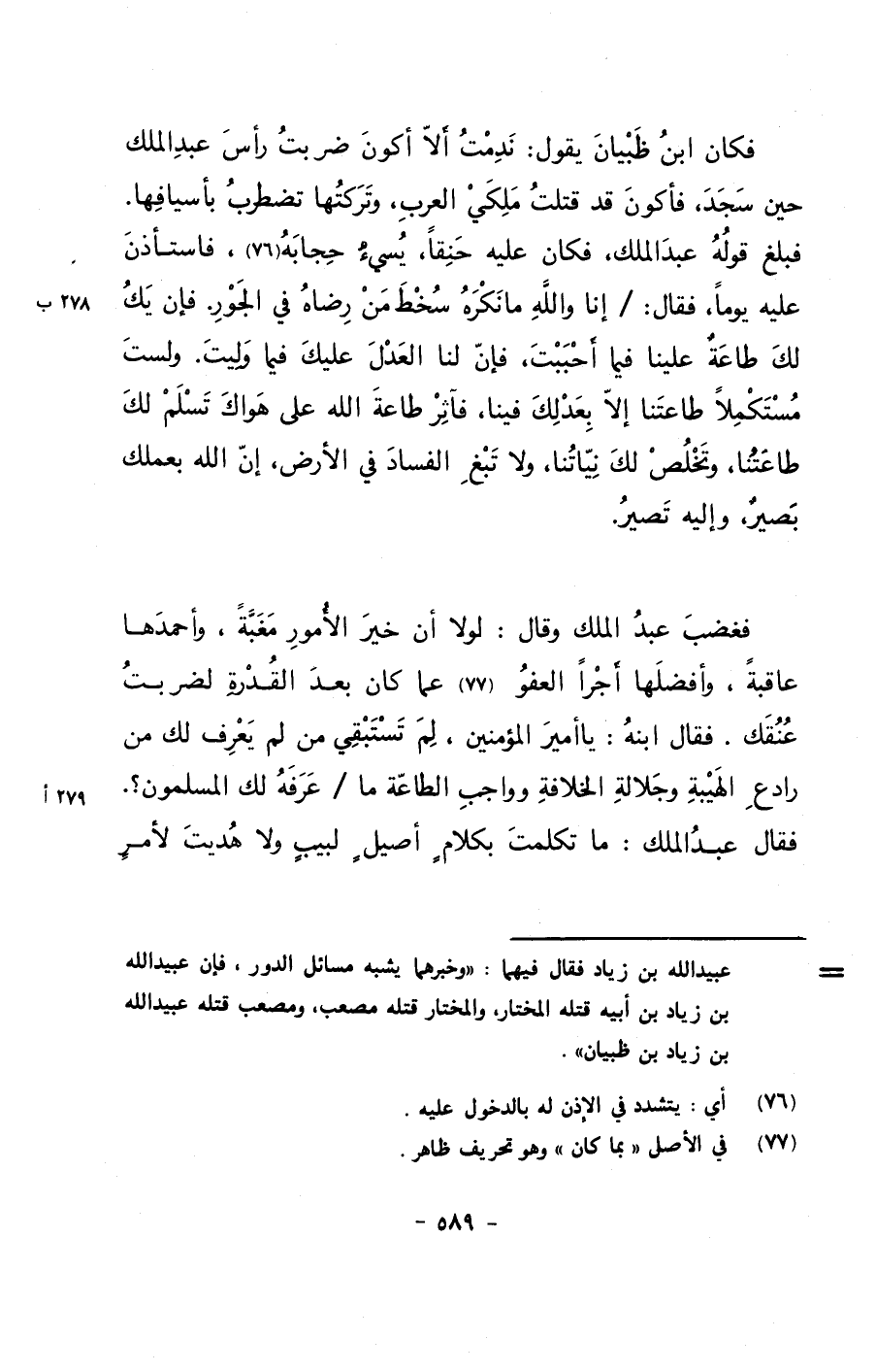 فغضب عبد الملك وقال: لولا أن خير الأمور مغبةً, وأحمدها عاقبةً, وأفضلها أجراً العفو عما كان بعد القدرة لضربت عنقك. فقال ابنه: يا أمير المؤمنين, لم تستبقي من لم يعرف لك من رادع الهيبة وجلالة الخلافة وواجب الطاعة ما/ عرفه لك المسلمون؟. فقال عبد الملك: ما تكلمت بكلامٍ أصيلٍ لبيبٍ ولا هديت لأمرٍ