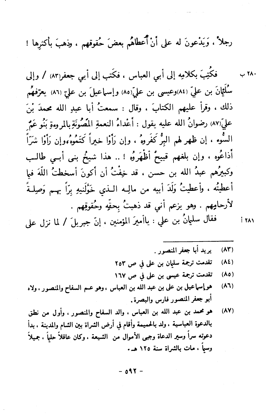 فكتب بكلامه إلى أبي العباس، فكتب إلى أبي جعفر/ وإلى سليمان بن علي وعيسى بن علي وإسماعيل بن علي يعرفهم ذلك، وقرأ عليهم الكتاب، وقال: سمعت أبا عبد الله محمد بن علي رضوان الله عليه يقول: أعداء النعمة المصونة بالمروءة بنو عم السوء، إن ظهر لهم البر كفروه، وإن رأوا خيراً كتموه، وإن رأوا شراً أذاعوه، وإن بلغهم قبيحٌ أظهروه!.. هذا شيخ بني أبي طالب وكبيرهم عبد الله بن حسن، قد خفت أن أكون أسخطت الله فيما أعطيته، وأعطيت ولد أبيه من ماله الذي خولنيه براً بهم وصلةً لأرحامهم. وهو يزعم أني قد ذهبت بحقه وحقوقهم.