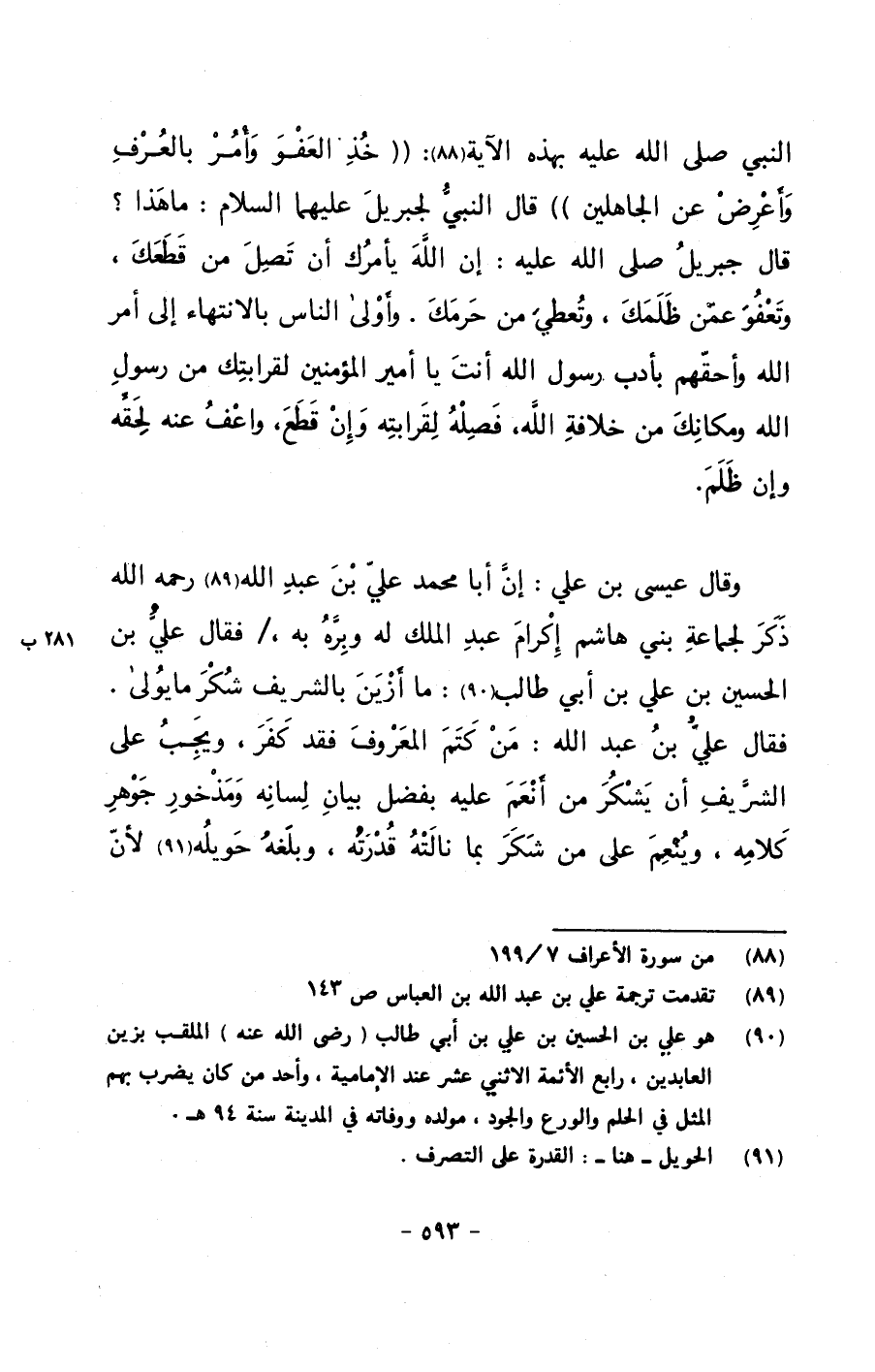 النبي صلى الله عليه وسلم بهذه الآية: {خذ العفو وأمر بالعرف وأعرض عن الجاهلين} قال النبي لجبريل عليهما السلام: ما هذا؟ قال جبريل صلى الله عليه: إن الله يأمرك أن تصل من قطعك، وتعفو عمن ظلمك، وتعطي من حرمك. وأولى الناس بالانتهاء إلى أمر الله وأحقهم بأدب رسول الله أنت يا أمير المؤمنين لقرابتك من رسول الله ومكانك من خلافة الله، فصله لقرابته وإن قطع، واعف عنه لحقه وإن ظلم.