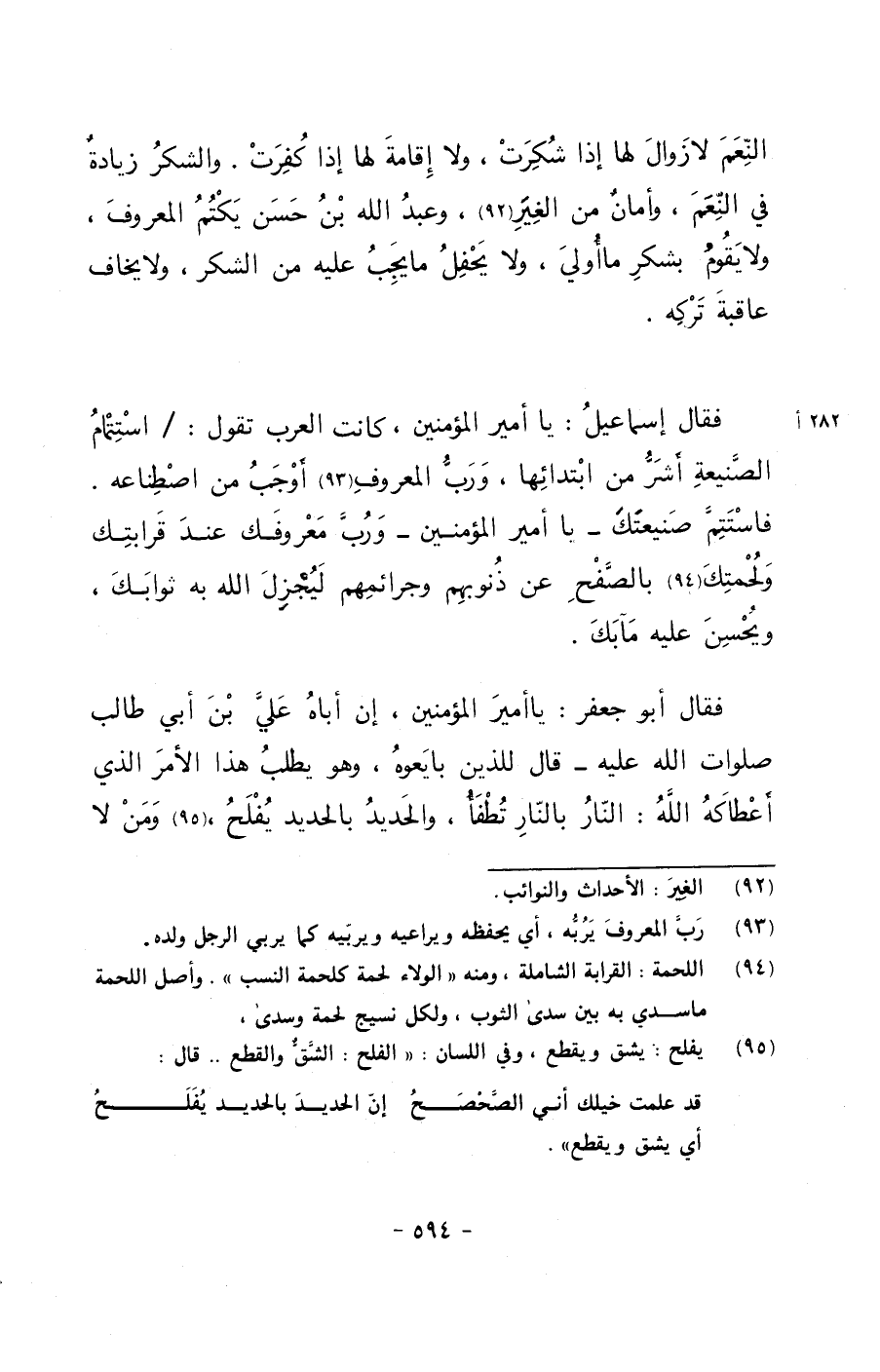 النعم لا زوال لها إذا شكرت، ولا إقامة لها إذا كفرت. والشكر زيادةٌ في النعم، وأمانٌ من الغير، وعبد الله بن حسن يكتم المعروف، ولا يقوم بشكر ما أولي، ولا يحفل ما يجب عليه من الشكر، ولا يخاف عاقبة تركه.