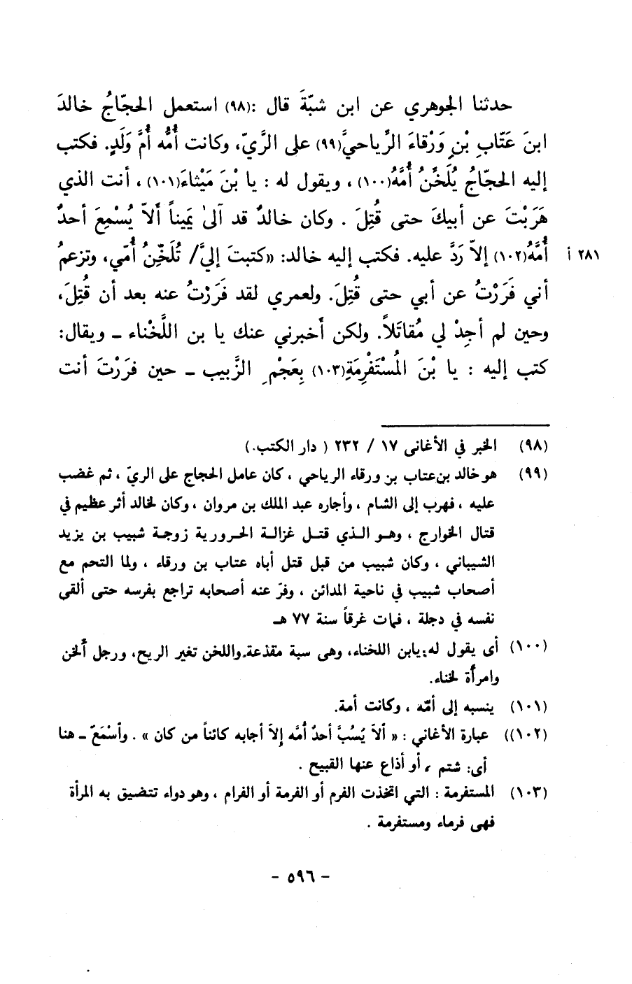 حدثنا الجوهري عن ابن شبة قال: استعمل الحجاج خالد ابن عتاب بن ورقاء الرياحي على الري، وكانت أمه أم ولدٍ. فكتب إليه الحجاج يلخن أمه، ويقول له: يا بن ميثاء، أنت الذي هربت عن أبيك حتى قتل. وكان خالدٌ قد آلى يميناً ألا يسمع أحدٌ أمه إلا رد عليه. فكتب إليه خالد: ((كتبت إلي/ تلخن أمي، وتزعم أني فررت عن أبي حتى قتل. ولعمري لقد فررت عنه بعد أن قتل، وحين لم أجد لي مقاتلاً. ولكن أخبرني عنك يا بن اللخناء -ويقال: كتب إليه: يا بن المستفرمة بعجم الزبيب- حين فررت أنت
