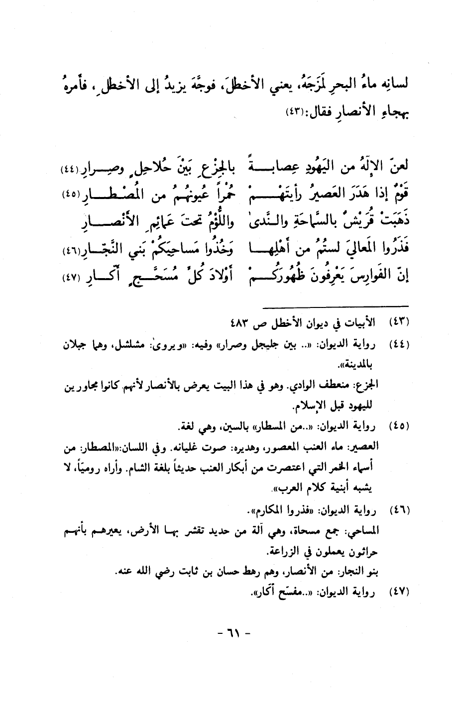 لسانه ماء البحر لمزجه، يعني الأخطل، فوجه يزيد إلى الأخطل، فأمره بهجاء الأنصار فقال: