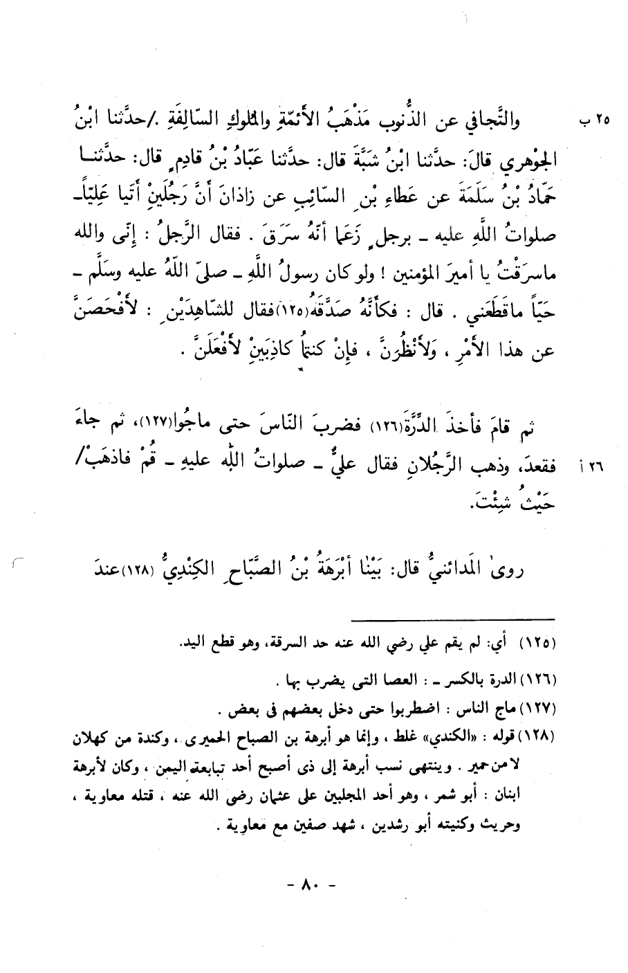والتجافي عن الذنوب مذهب الأئمة والملوك السالفة./ حدثنا ابن الجوهري قال: حدثنا ابن شبة قال: حدثنا عباد بن قادمٍ قال: حدثنا حماد بن سلمة عن عطاء بن السائب عن زاذان أن رجلين أتيا علياً –صلوات الله عليه- برجلٍ زعما أنه سرق. فقال الرجل: إني والله ما سرقت يا أمير المؤمنين! ولو كان رسول الله - صلى الله عليه وسلم - حياً ما قطعني. قال: فكأنه صدقه فقال للشاهدين: لأفحصن عن هذا الأمر, ولأنظرن, فإن كنتما كاذبين لأفعلن.