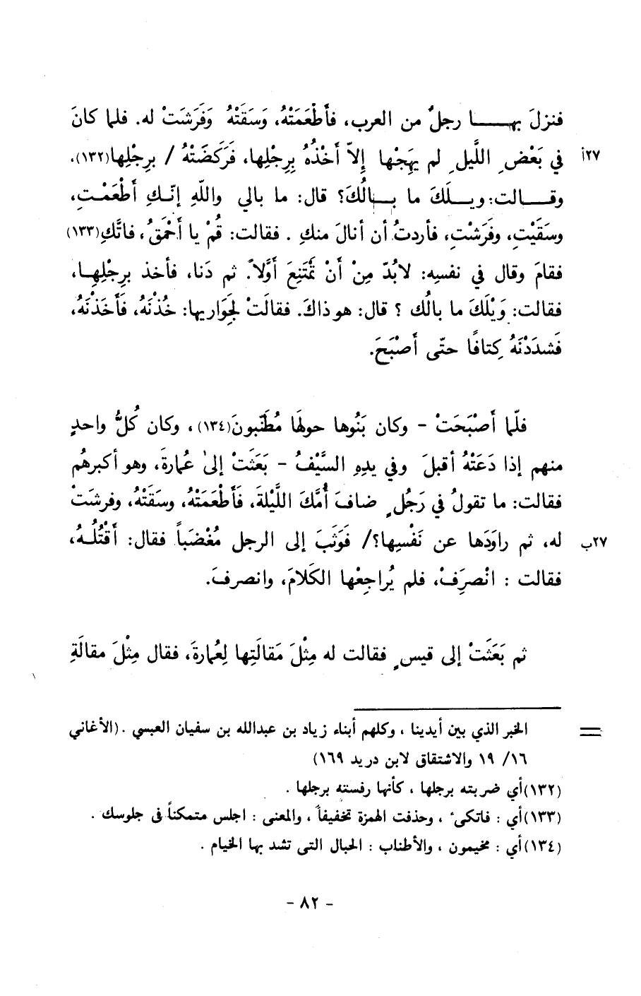 فنزل بها رجلٌ من العرب، فأطعمته، وسقته وفرشت له. فلما كان في بعض الليل لم يهجها إلا أخذه برجلها، فركضته/ برجلها. وقالت: ويلك ما بالك؟ قال: ما بالي والله إنك أطمعت، وسقيت، وفرشت، فأردت أن أنال منك. فقالت: قم يا أحمق، فاتك فقام وقال في نفسه: لا بد من أن تمتنع أولاً. ثم دنا، فأخذ برجلها، فقالت: ويلك ما بالك؟ قال: هو ذاك. فقالت لجواريها: خذنه، فأخذنه، فشددنه كتافاً حتى أصبح.