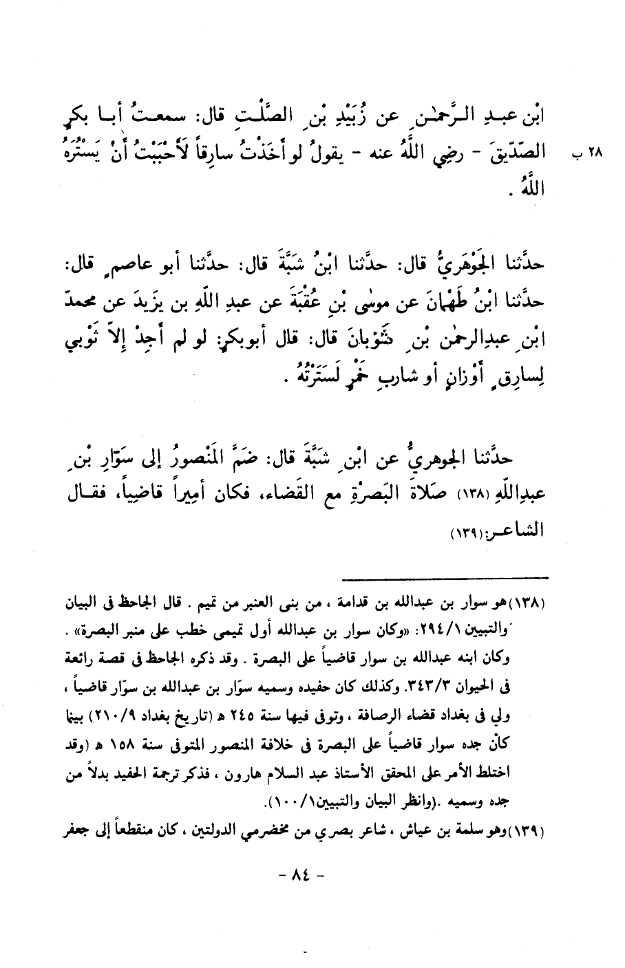 حدثنا الجوهري قال: حدثنا ابن شبة قال: حدثنا أبو عاصمٍ قال: حدثنا ابن طهمان عن موسى بن عقبة عن عبد الله بن يزيد عن محمد ابن عبد الرحمن بن ثوبان قال: قال أبو بكرٍ: لو لم أجد إلا ثوبي لسارقٍ أوزانٍ أو شاربٍ خمرٍ لسترته.