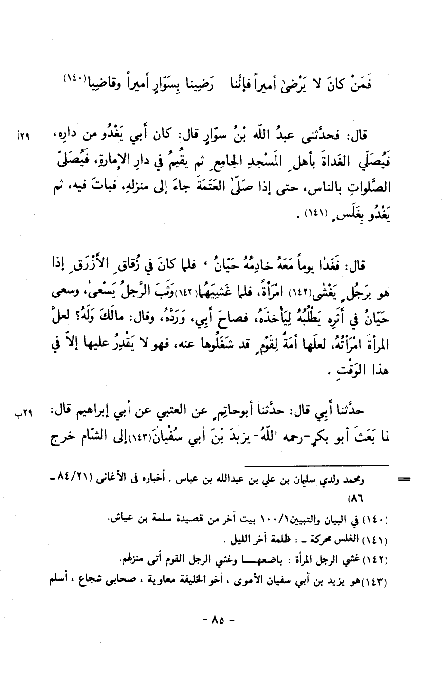 قال: فغدا يوماً معه خادمه حيان، فلما كان في زقاق الأزرق إذا هو برجلٍ يغشى امرأةً، فلما غشيهما وثب الرجل يسعى، وسعى حيان في أثره يطلبه ليأخذه، فصاح أبي، ورده، وقال: ما لك وله؟ لعل المرأة امرأته، لعلها أمةٌ لقومٍ قد شغلوها عنه، فهو لا يقدر عليها إلا في هذا الوقت.