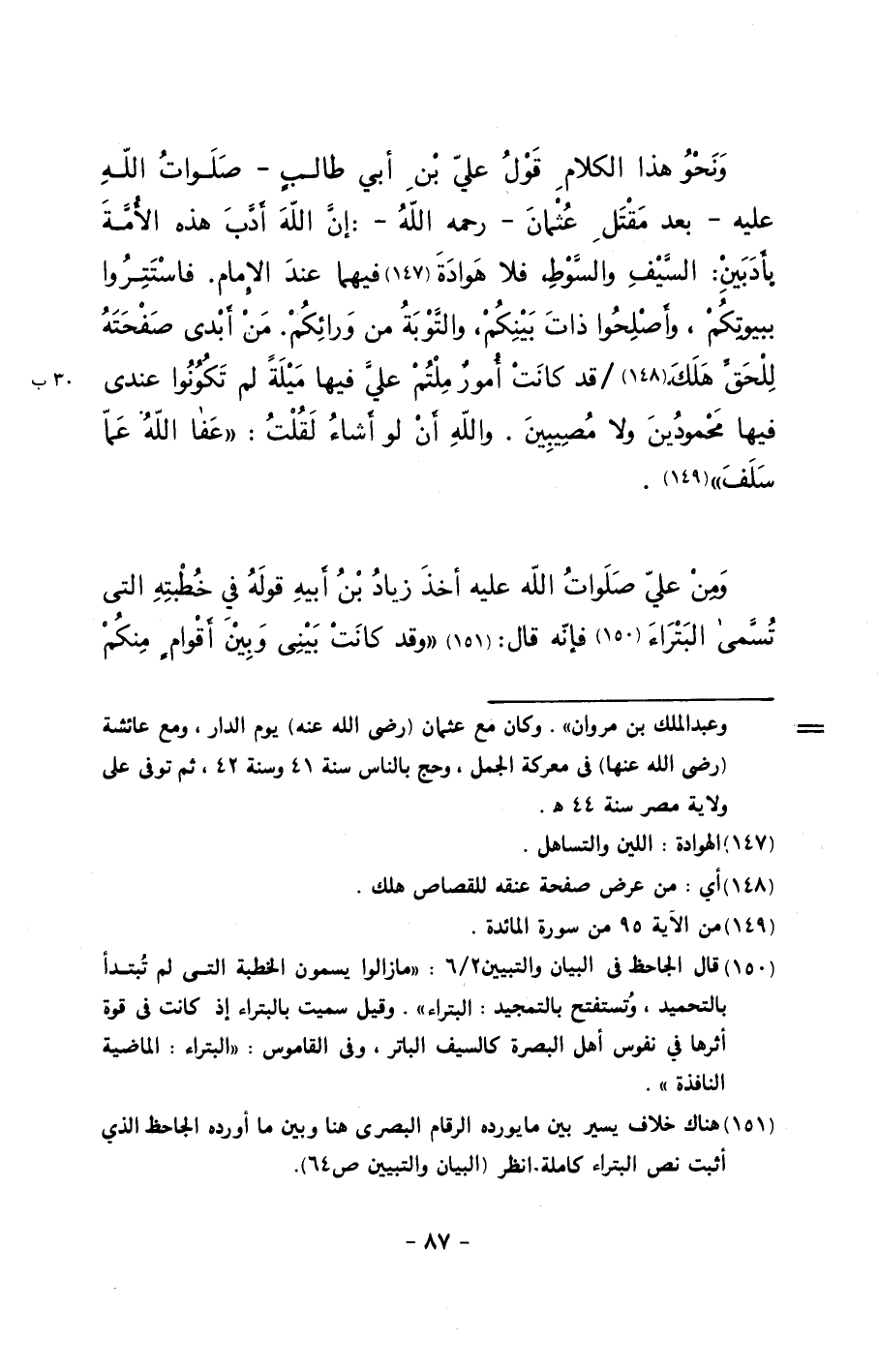 ونحو هذا الكلام قول علي بن أبي طالب –صلوات الله عليه- بعد مقتل عثمان –رحمه الله-: إن الله أدب هذه الأمة بأدبين: السيف والسوط، فلا هوادة فيهما عند الإمام. فاستتروا ببيوتكم، وأصلحوا ذات بينكم، والتوبة من ورائكم. من أبدى صفحته للحق هلك./ قد كانت أمورٌ ملتم علي فيها ميلةً لم تكونوا عندي فيها محمودين ولا مصيبين. والله أن لو أشاء لقلت: ((عفا الله عما سلف)).