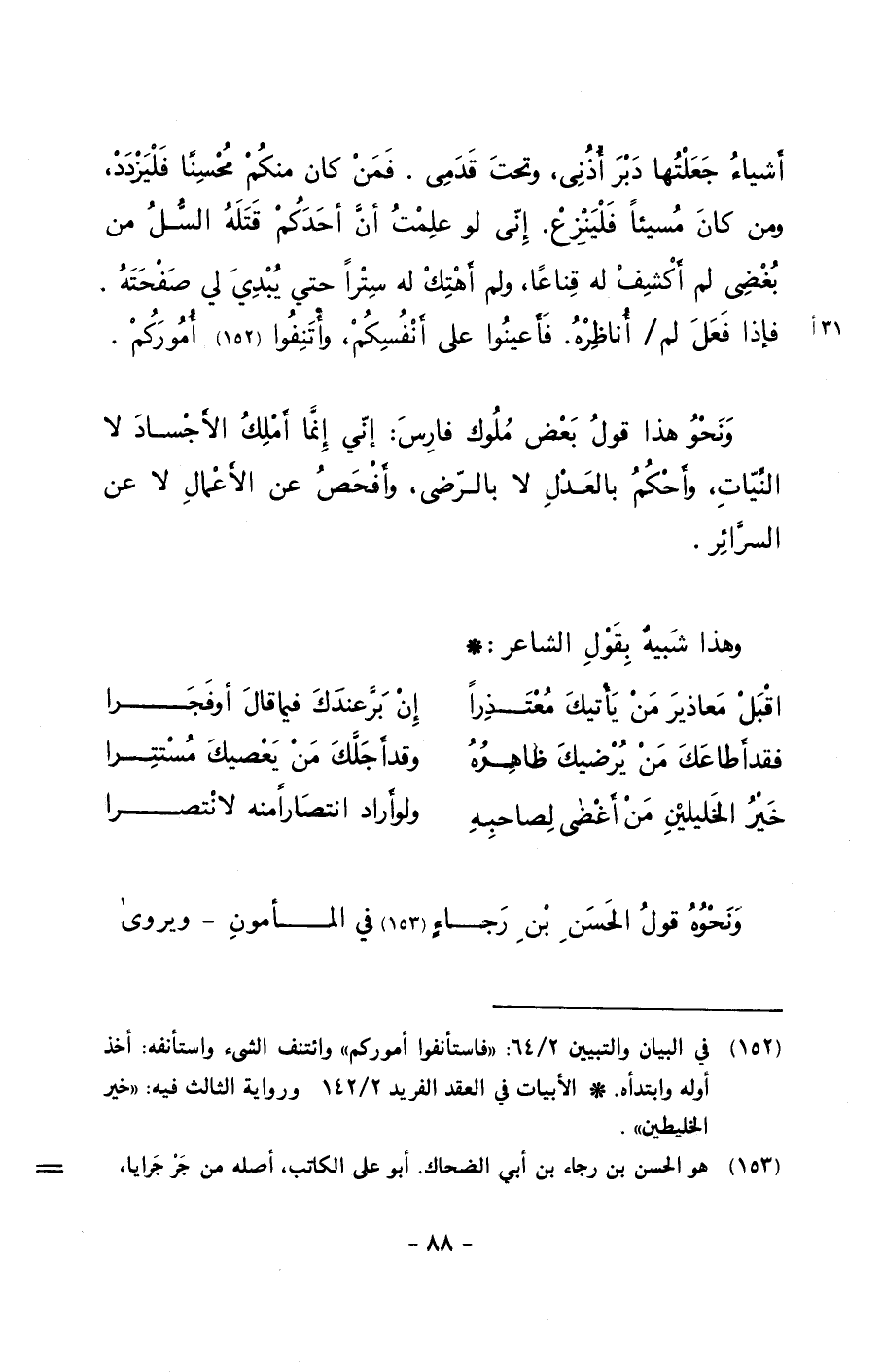 ونحو هذا قول بعض ملوك فارس: إني إنما أملك الأجساد لا النيات, وأحكم بالعدل لا بالرضى, وأفحص عن الأعمال لا عن السرائر.