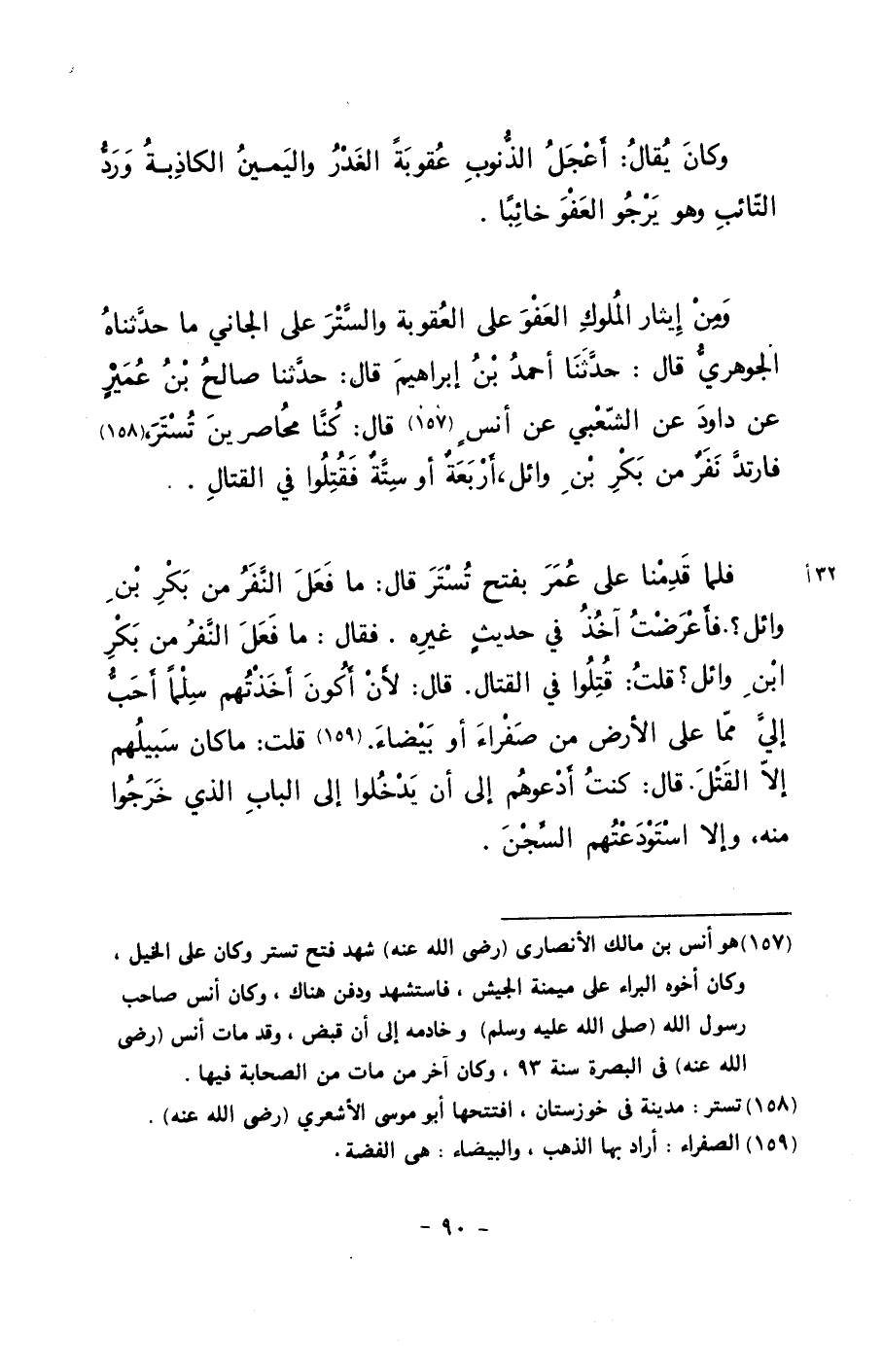 ومن إيثار الملوك العفو على العقوبة والستر على الجاني ما حدثناه الجوهري قال: حدثنا أحمد بن إبراهيم قال: حدثنا صالح بن عميرٍ عن داود عن الشعبي عن أنسٍ قال: كنا محاصرين تستر, فارتد نفرٌ من بكر بن وائل, أربعةٌ أو ستةٌ فقتلوا في القتال.