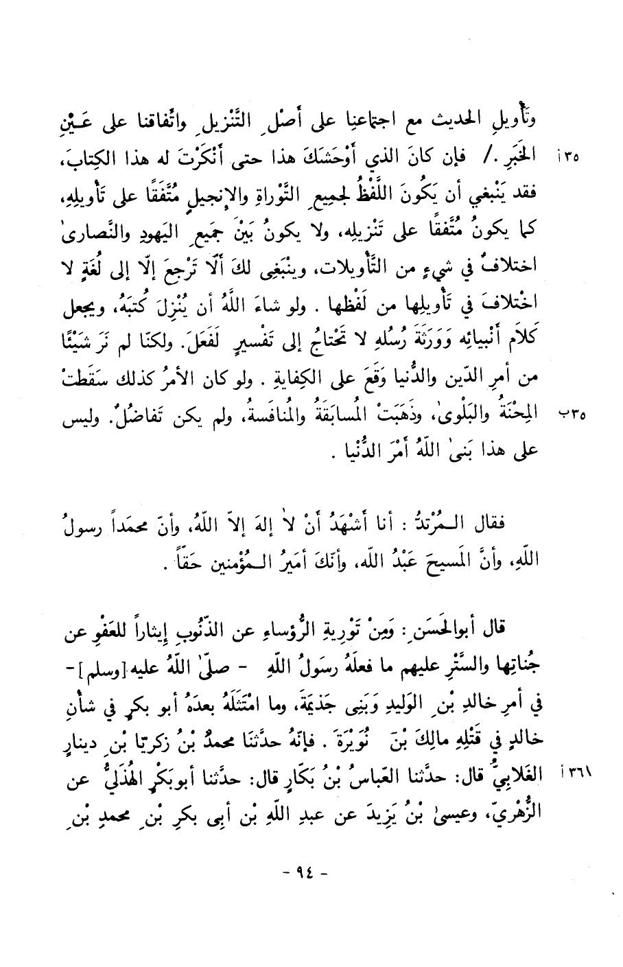 وتأويل الحديث مع اجتماعنا على أصل التنزيل واتفاقنا على عين الخبر./ فإن كان الذي أوحشك هذا حتى أنكرت له هذا الكتاب، فقد ينبغي أن يكون اللفظ لجميع التوراة والإنجيل متفقاً على تأويله،كما يكون متفقاً على تنزيله، ولا يكون بين جميع اليهود والنصارى اختلافٌ في شيءٍ من التأويلات، وينبغي لك ألا ترجع إلا إلى لغةٍ لا اختلاف في تأويلها من لفظها. ولو شاء الله أن ينزل كتبه، ويجعل كلام أنبيائه وورثة رسله لا تحتاج إلى تفسيرٍ لفعل. ولكنا لم نر شيئاً من أمر الدين والدنيا وقع على الكفاية. ولو كان الأمر كذلك سقطت المحنة والبلوى، وذهبت المسابقة والمنافسة، ولم يكن تفاضلٌ. وليس على هذا بنى الله أمر الدنيا.
