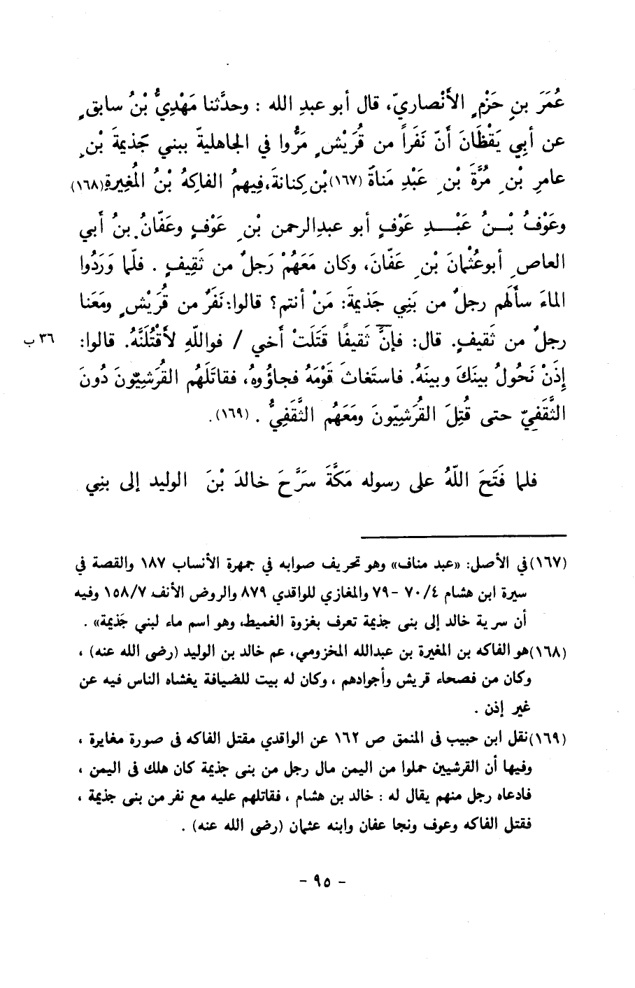 عمر بن حزمٍ الأنصاري، قال أبو عبد الله: وحدثنا مهدي بن سابقٍ عن أبي يقظان أن نفراً من قريشٍ مروا في الجاهلية ببني جذيمة بن عامر بن مرة بن عبد مناة بن كنانة، فيهم الفاكه بن المغيرة وعوف بن عبد عوفٍ أبو عبد الرحمن بن عوفٍ وعفان بن أبي العاص أبو عثمان بن عفان، وكان معهم رجلٌ من ثقيفٍ. فلما وردوا الماء سألهم رجلٌ من بني جذيمة: من أنتم؟ قالوا: نفرٌ من قريشٍ ومعنا رجلٌ من ثقيفٍ. قال: فإن ثقيفاً قتلت أخي/ فوالله لأقتلنه. قالوا: إذن نحول بينك وبينه. فاستغاث قومه فجاؤوه، فقاتلهم القرشيون دون الثقفي حتى قتل القرشيون ومعهم الثقفي.