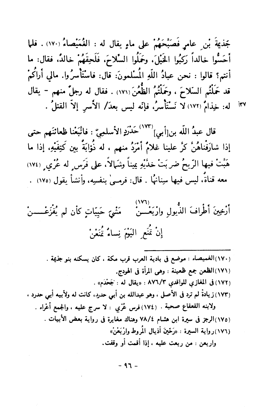 جذيمة بن عامرٍ فصبحهم على ماءٍ يقال له: الغميصاء. فلما أحسوا خالداً ركبوا الخيل، وحملوا السلاح، فلحقهم خالدٌ، فقال: ما أنتم؟ قالوا: نحن عباد الله المسلمون، قال: فاستأسروا. ما لي أراكم قد حملتم السلاح، وحملتم الظعن. فقال له رجلٌ منهم – يقال له: خذامٌ لا نستأسر، فإنه ليس بعد/ الأسر إلا القتل.