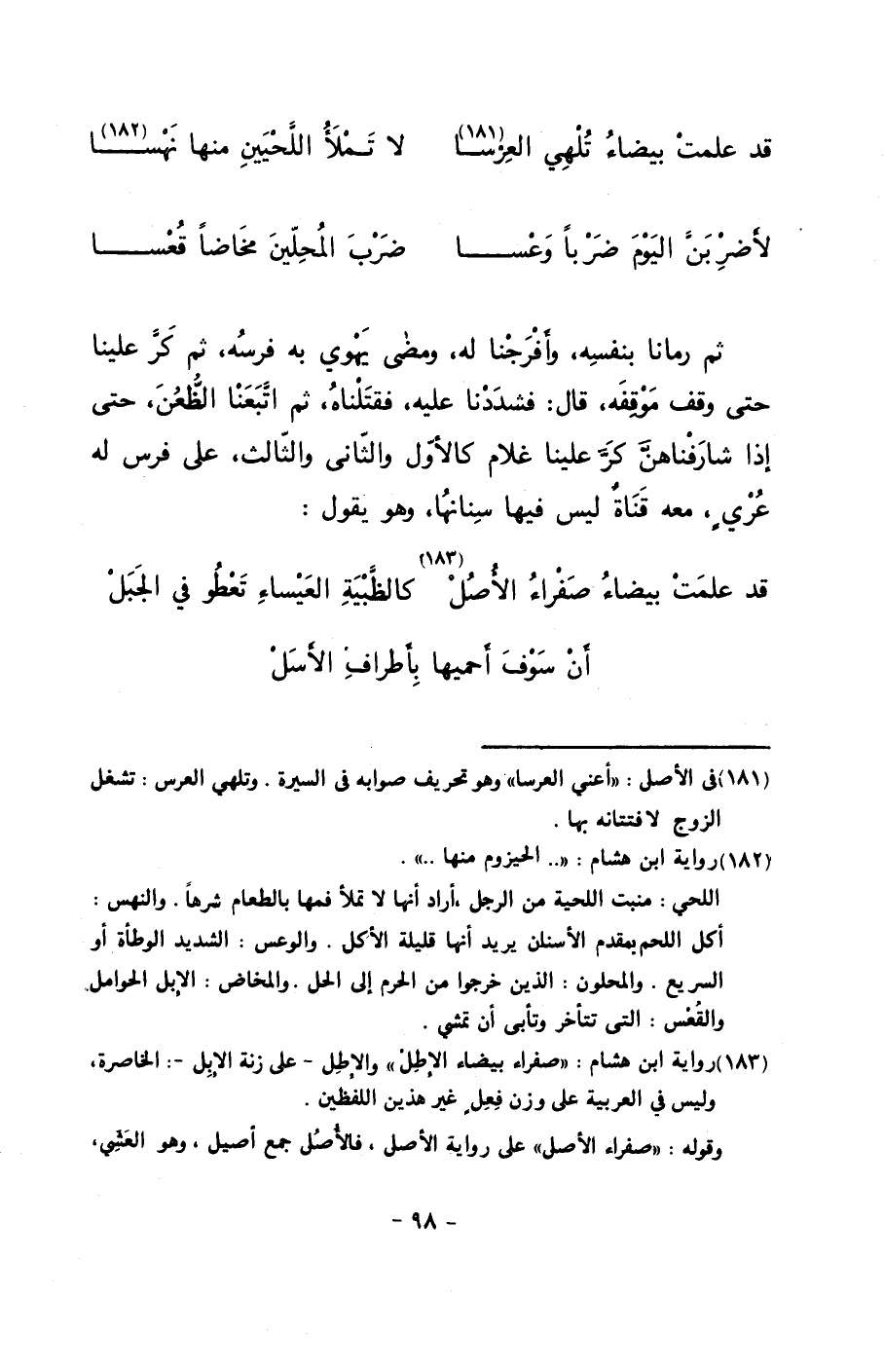 ثم رمانا بنفسه, وأفرجنا له, ومضى يهوي به فرسه, ثم كر علينا حتى وقف موقفه, قال: فشددنا عليه, فقتلناه, ثم اتبعنا الظعن, حتى إذا شارفناهن كر علينا غلام كالأول والثاني والثالث, على فرس له عريٍ, معه قناةٌ ليس فيها سنانها, وهو يقول: