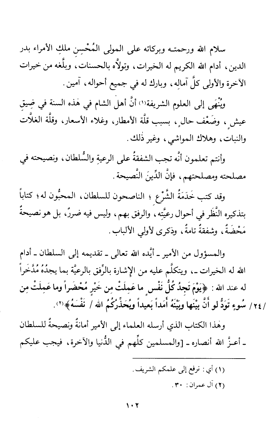 وهؤلاء علماء المسلمينَ في بلاد السلطان -أعزَّ الله أنصاره- مُتَّفِقون على هذا، وبيت المال -بحَمْدِ الله- معمورٌ، زادَهُ الله عمارةً وسَعَةً وخيراً وبركةً في حياة السلطانِ المقرونةِ بكمالِ السعادةِ له،