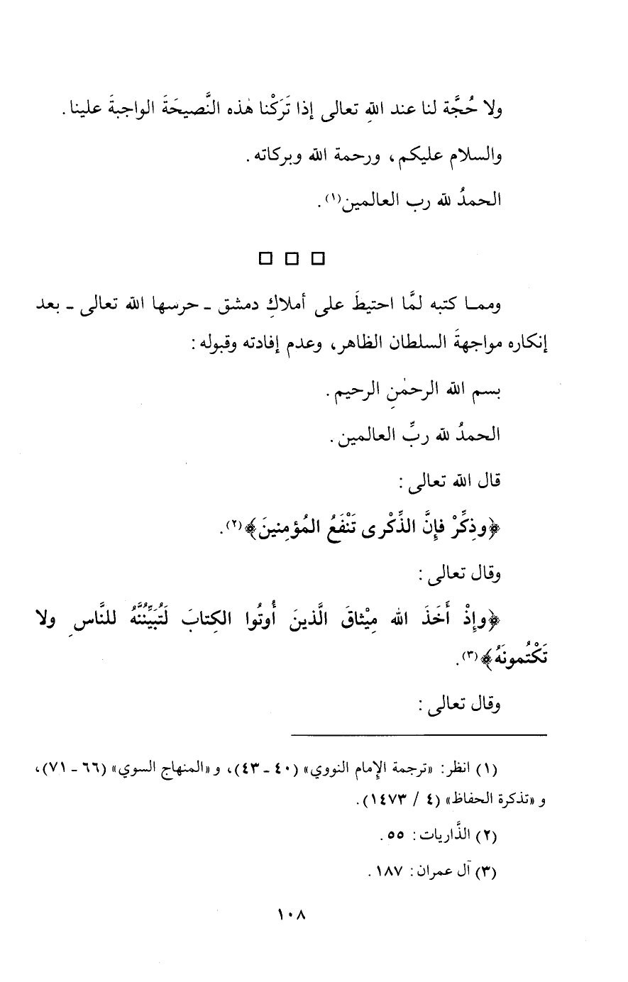 وقد أنعم الله تعالى علينا وعلى سائِر المسلمين بالسلطان -أعز الله أنصارهُ- فقد أقامَه لنُصْرَةِ الدِّينِ، والذبِّ عن المسلمين، وأذل بهِ الأعداءَ مِن جميع الطوائِف، وفتحَ عليهِ الفتوحاتِ المشهورةَ في المدةِ اليسيرةِ، وأوْقَعَ اَلرُّعْبَ منه في قلوب أعداء الدين، وسائر الماردين، ومهَّدَ له البلادَ والعبادَ، وقَمَعَ بسببهِ أهلَ الزَّيْغِ والفساد، وأمدهُ بالإعانةِ واللطفِ والسعادةِ.