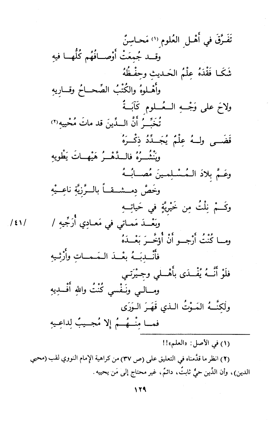 وقال الأديبُ الفاضلُ المحدِّثُ أبو الحسن عليُّ بن المظفر بن إبراهيم الكِنْديُّ (¬3)، يرثي شَيْخَنا الإمامَ العلاَّمَةَ الحافظَ المُفْتي الزاهدَ الورعَ أنموذجَ الطِّرازِ الأوَّل، محيي الدين يحيى النواوي الشافعي -رضي الله عنه-، متقرباً بذلك إلى الله سبحانه وتعالى: