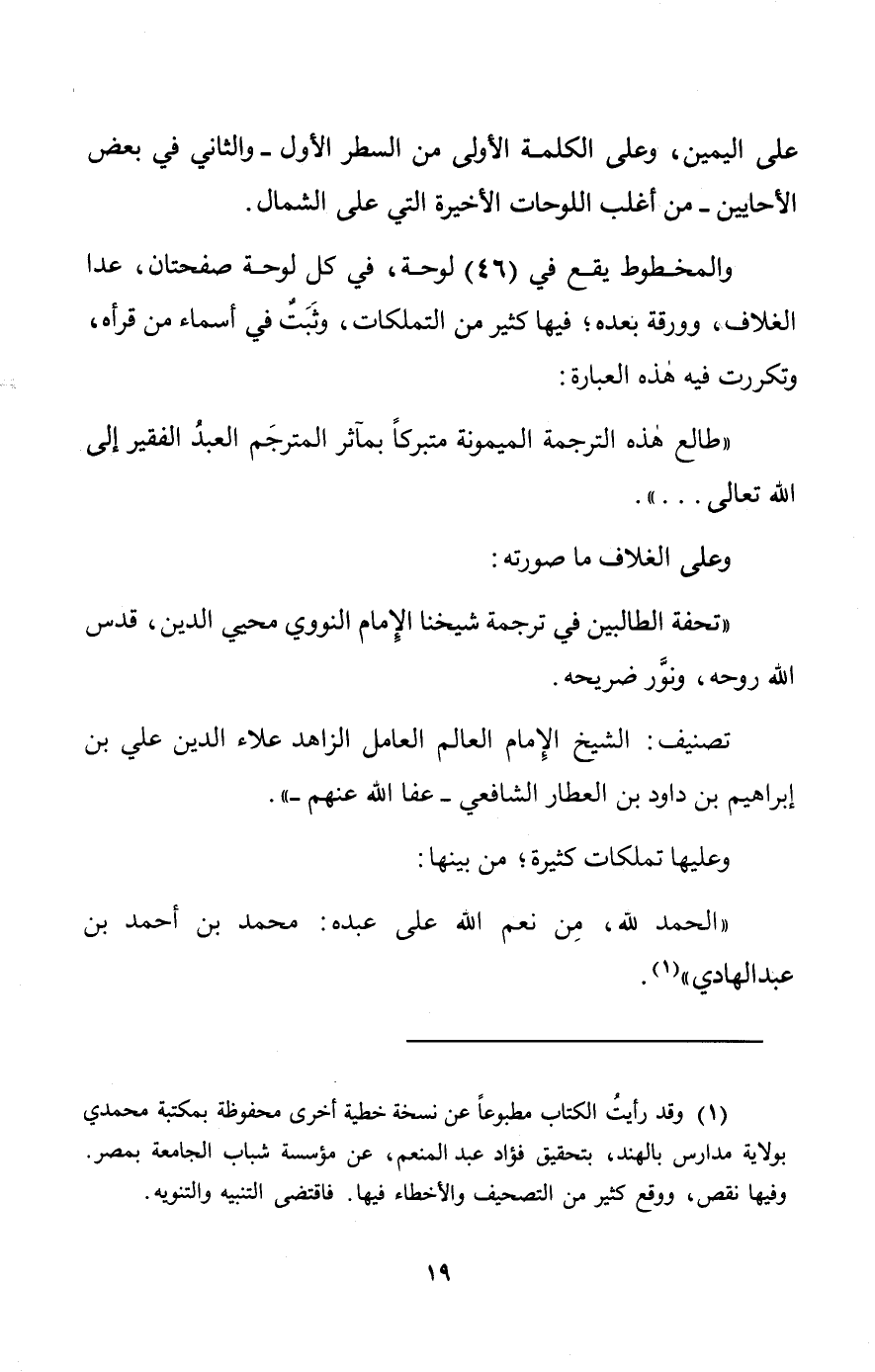 (¬1) وقد رأيتُ الكتاب مطبوعاً عن نسخة خطية أخرى محفوظة بمكتبة محمدي بولاية مدارس بالهند، بتحقيق فؤاد عبد المنعم، عن مؤسسة شباب الجامعة بمصر، وفيها نقص، ووقع كثير من التصحيف والأخطاء فيها، فاقتضى التنبيه والتنويه.