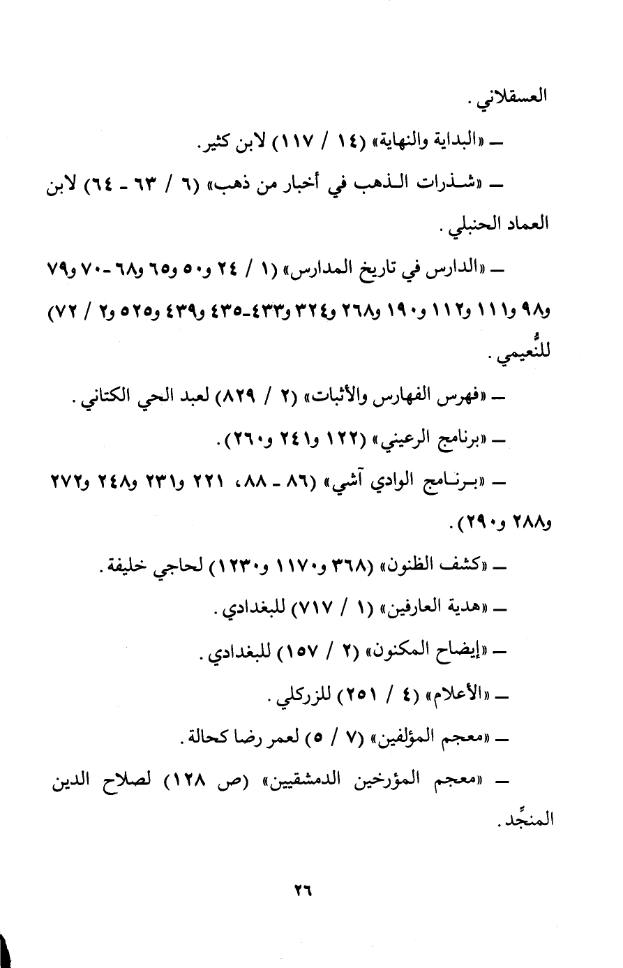 - "الدارس في تاريخ المدارس" (1/ 24 و 50 و 65 و 68 - 70 و 79 و 98 و111 و122 و190 و 268 و324 و433 - 435 و 439 و 525 و2/ 72) للنُّعيمي.