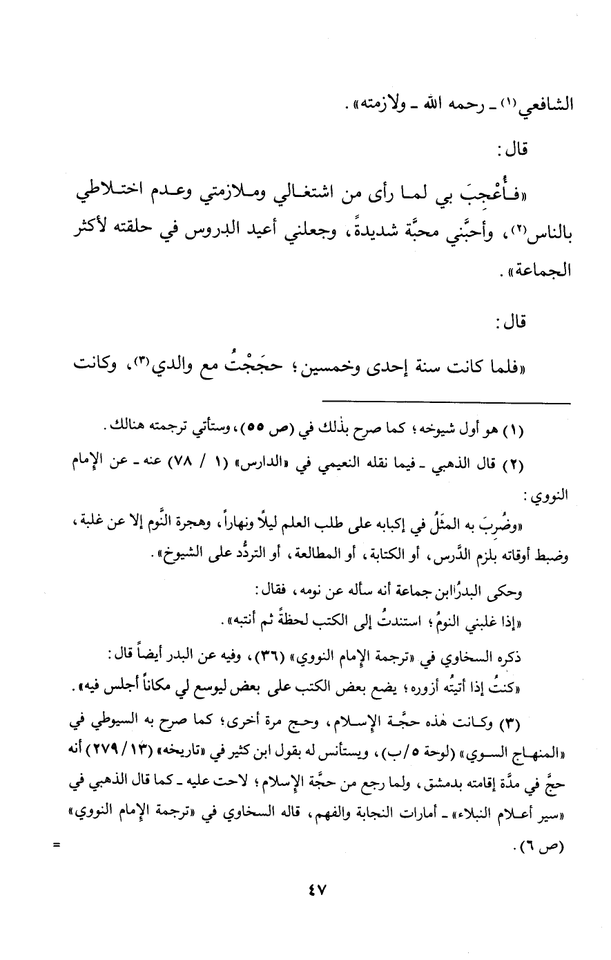 (¬3) وكانت هذه حجة الإسلام، وحج مرة أخرى؛ كما صرح به السيوطي في "المنهاج السوي" (لوحة 5/ ب)، ويستأنس له بقول ابن كثير في "تاريخه" (13/ 279) أنه حج في مدَّة إقامته بدمشق، ولما رجع من حجة الإسلام؛ لاحت عليه -كما قال الذهبي في "سير أعلام النبلاء"- أمارات النجابة والفهم، قاله السخاوي في "ترجمة الإمام النووي" (ص 6).