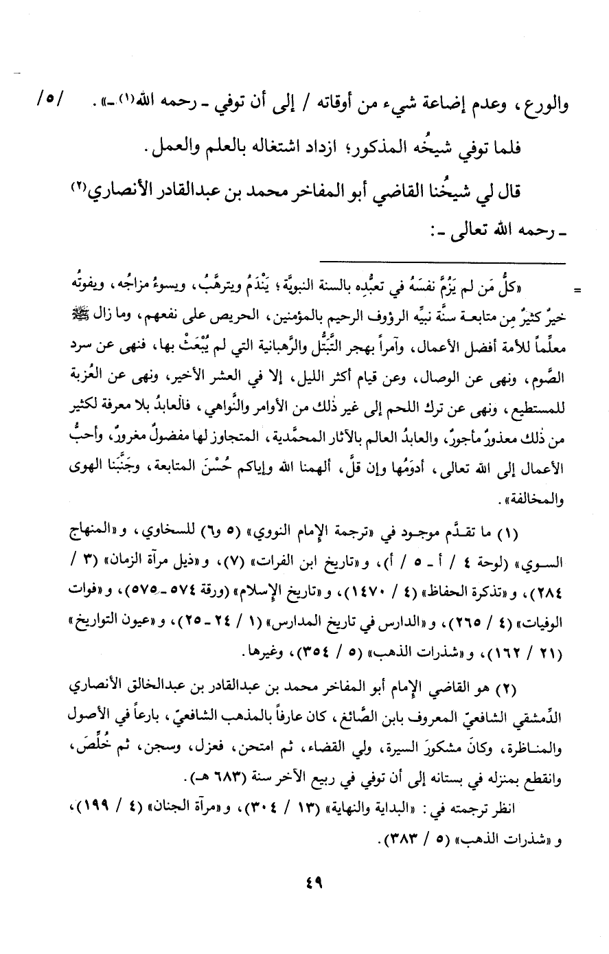 (¬1) هو القاضي الإمام أبو المفاخر محمد بن عبد القادر بن عبد الخالق الأنصاري الدِّمشقي الشافعي المعروف بابن الصَّائغ، كان عارفاً بالمذهب الشافعيّ، بارعاً في الأصول والمناظرة، وكانَ مشكورَ السيرة، ولي القضاء، ثم امتحن، فعزل، وسجن، ثم خُلِّصَ، وانقطع بمنزله في بستانه إلى أن توفي في ربيع الآخر سنة (683 هـ).