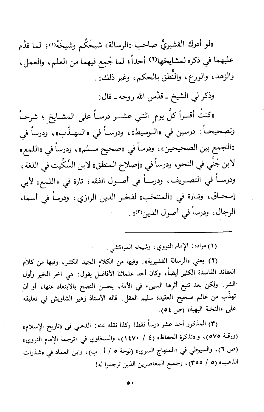 (¬2) عقَّبَ الشيخ عبد الغني الدَّقْر في كتابه "الإمام النووي" (ص 34) على ما ذكره المصنف بقوله: "اثنا عشر درساً يقرؤها على المشايخ كل يوم شرحاً وتصحيحاً، ويعلق ما يتعلق بها من شرح مشكل، وإيضاح عبارة، وضبط لغة، تحتاج كل يوم بلى اثنتي عشرة ساعة على أقل تقدير، وتحتاج إلى مراجعة ما يجب أن يراجع، وحفظ ما يجب أن يُحفظ -بأدنى التقدير- إلى اثنتي عشرة ساعة، فهذه أربع وعشرون ساعة، فمتى ينام؟! ومتى يأكل؟! ومتى يقوم بعبادته؟! ومتى يتهجد في ليله؟! ومعروف أنه سباق بلى الطاعات والعبادات ... متي يكون هذا كله وهو محتاج في دراسته ومراجعته إلى أربع وعشرين ساعة في اليوم والليل!