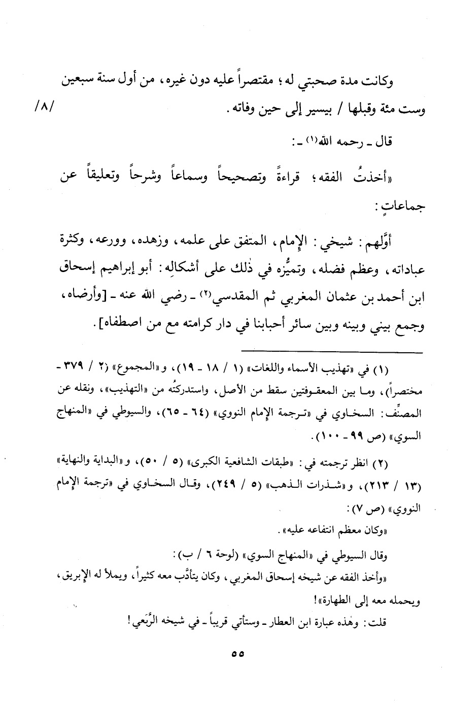 (¬1) نعته النووي في "طبقات الشافعية" (1/ 476) رقم (171) بقوله: "شيخنا الإمام البارع المتقن المحقق المدقق، إمام المذهب في عصره، والمرجوع إليه في حلِّ مشكلاته وتعرُّف خفياته، والمتفق على إمامته وجلالته وفضله ونزاهته"، وقال بعد كلام: "وحضرت غَسْلَه، قرأت عليه "أُنْس الأحياء ونور الأولياء"".