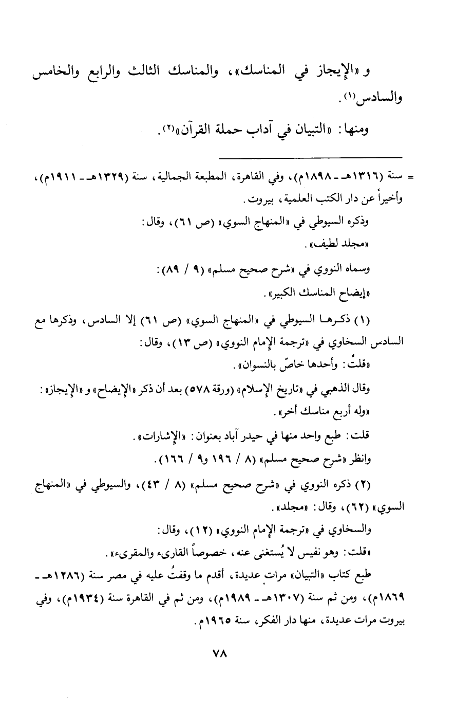 (¬1) ذكره النووي في "شرح صحيح مسلم" (1/ 183) وفي "تهذيب الأسماء واللغات" (1/ 38، 43، .. ) والذهبي في تذكرة الحفاظ، (4/ 1472) واليافعي في "مرآة الجنان، (4/ 182) وابن قاضي شهبة في "الطبقات" (2/ 257) وابن العماد في "الشذرات" (5/ 357) والسخاوي في "ترجمة الإمام النووي" (ص 13)، وقال: "قلت: وقد زاد فيها تصحيحات واختيارات حسان؛ كما صرَّح به العماد ابن كثير".