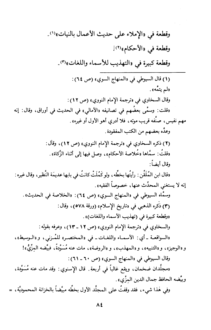 وقال السخاوي في "ترجمة الإمام النووي" (ص 14): "قلت: هو -كما قال ابنُ الملقِّن- نفيس. قال: وكأنه مختصر "شرح المهذب" وقال غيره: إنه ذكر فيه مسائل كثيرة محضة، وقواعد وضوابط لم يذكرها في "الروضة"، وقال في مقدمته: حصل عندي نحو مئة مصنَّف من كتب أصحابنا". ونسبه له ابن قاضي شهبة في "الطبقات" (2/ 156)، والبغدادي في "هدية العارفين" (2/ 524).