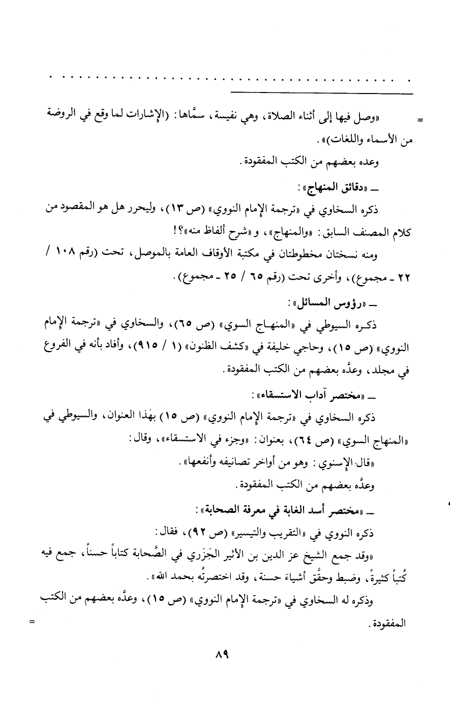 - "مختصر البسملة": ذكره السخاوي في "ترجمة الإمام النووي" (ص 15)، وقال: "رأيته بخطه، وهو في "شرح المهذب" بتمامه". قلت: هو فيه (م 3 ص 267 وما بعدها).