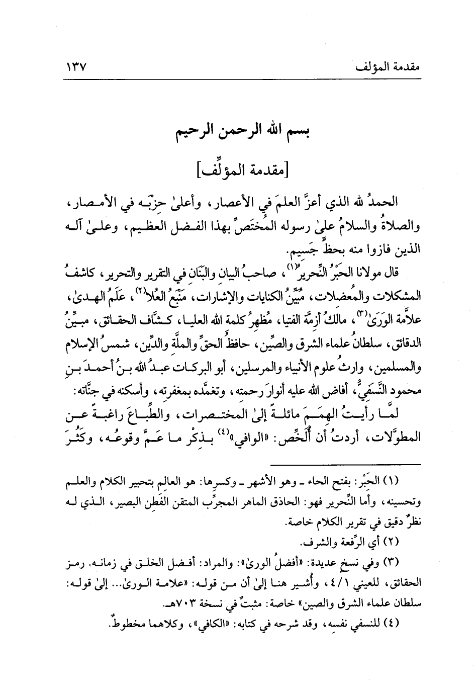 قال مولانا الحبر النّحرير صاحب البيان والبنان في التّقرير والتّحرير كاشف المشكلات والمعضلات مبيّن الكنايات والإشارات منبع العلا علم الهدى، علامة الورى، مالك أزمة الفتيا، مظهر كلمة الله العليا، كشاف الحقائق، مبين الدقائق، سلطان علماء الشرق والصين، حافظ الحقّ والملّة والدّين شمس الإسلام والمسلمين وارث علوم الأنبياء والمرسلين أبو البركات عبد الله بن أحمد بن محمود النّسفيّ، أفاض الله عليه أنوار رحمته، وتغمده بمغفرته، وأسكنه في جناته: