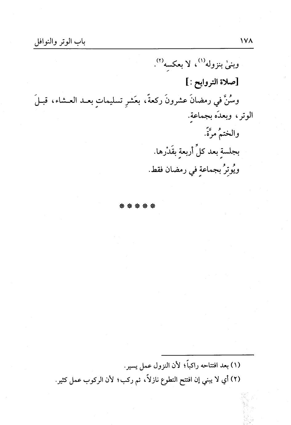 وسنّ في رمضان عشرون ركعةً بعشر تسليماتٍ بعد العشاء قبل الوتر وبعده بجماعةٍ