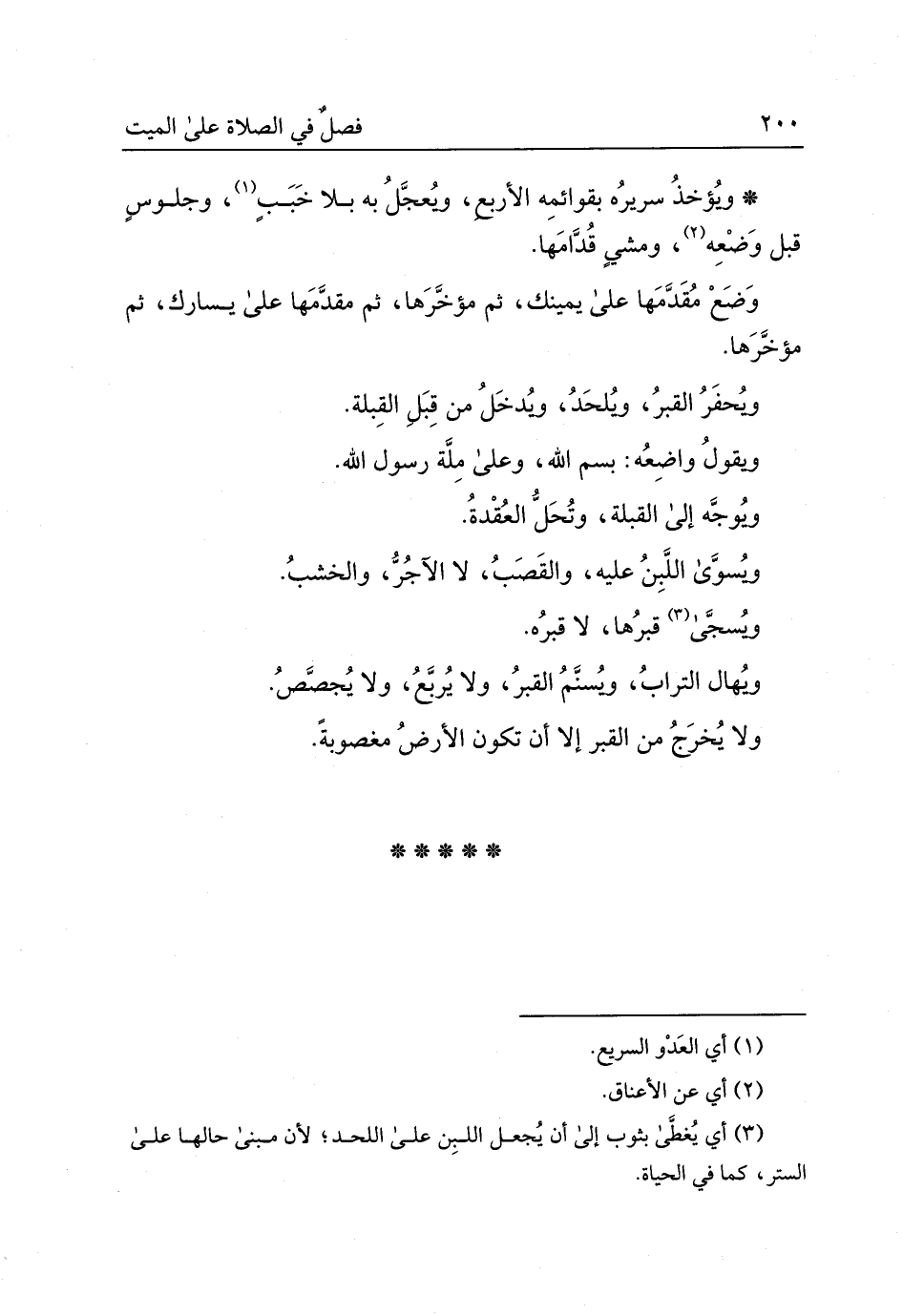 ويؤخذ سريره بقوائمه الأربع ويعجّل به بلا خببٍ وجلوسٍ قبل وضعها ومشيٍ قدّامها